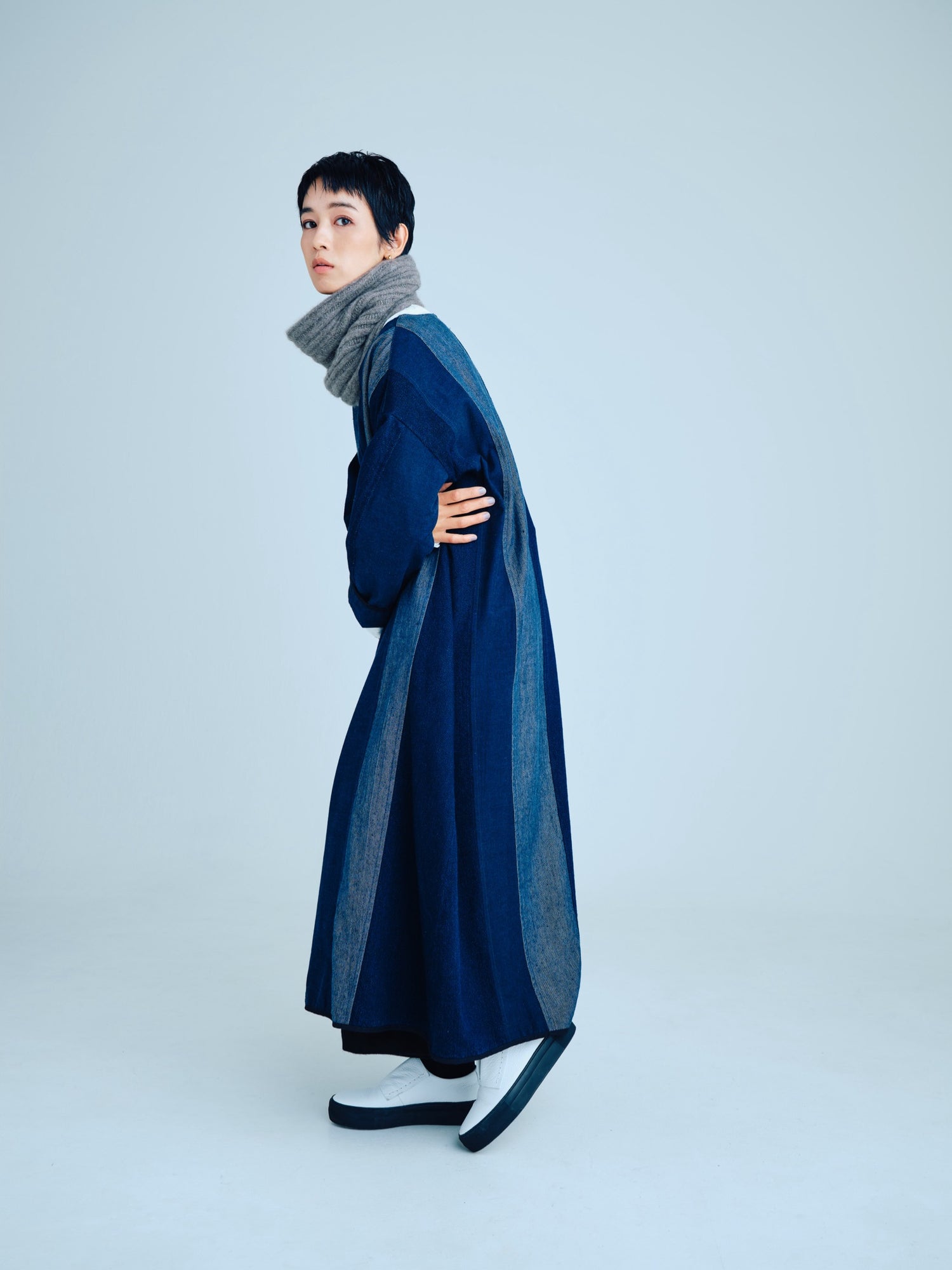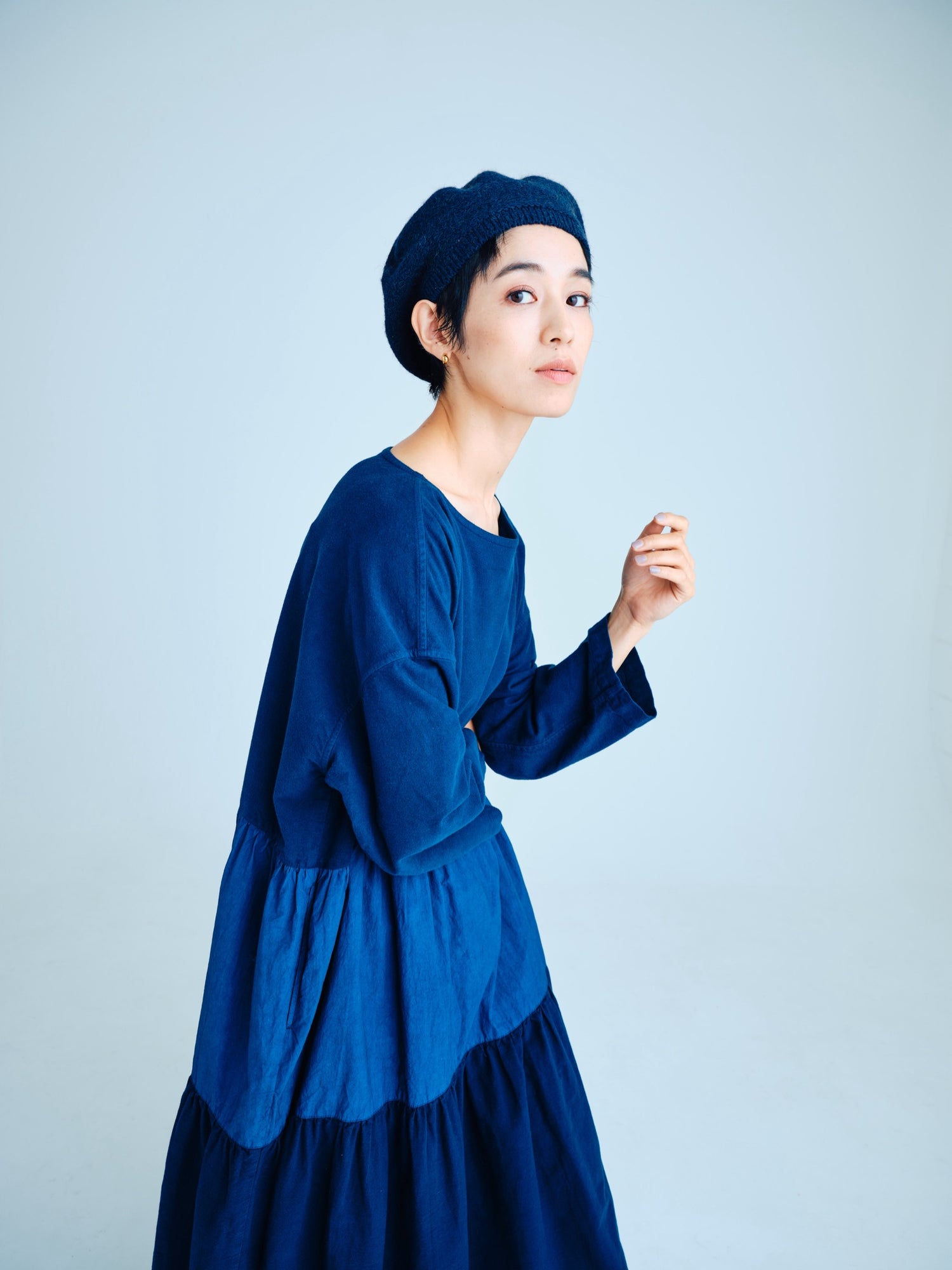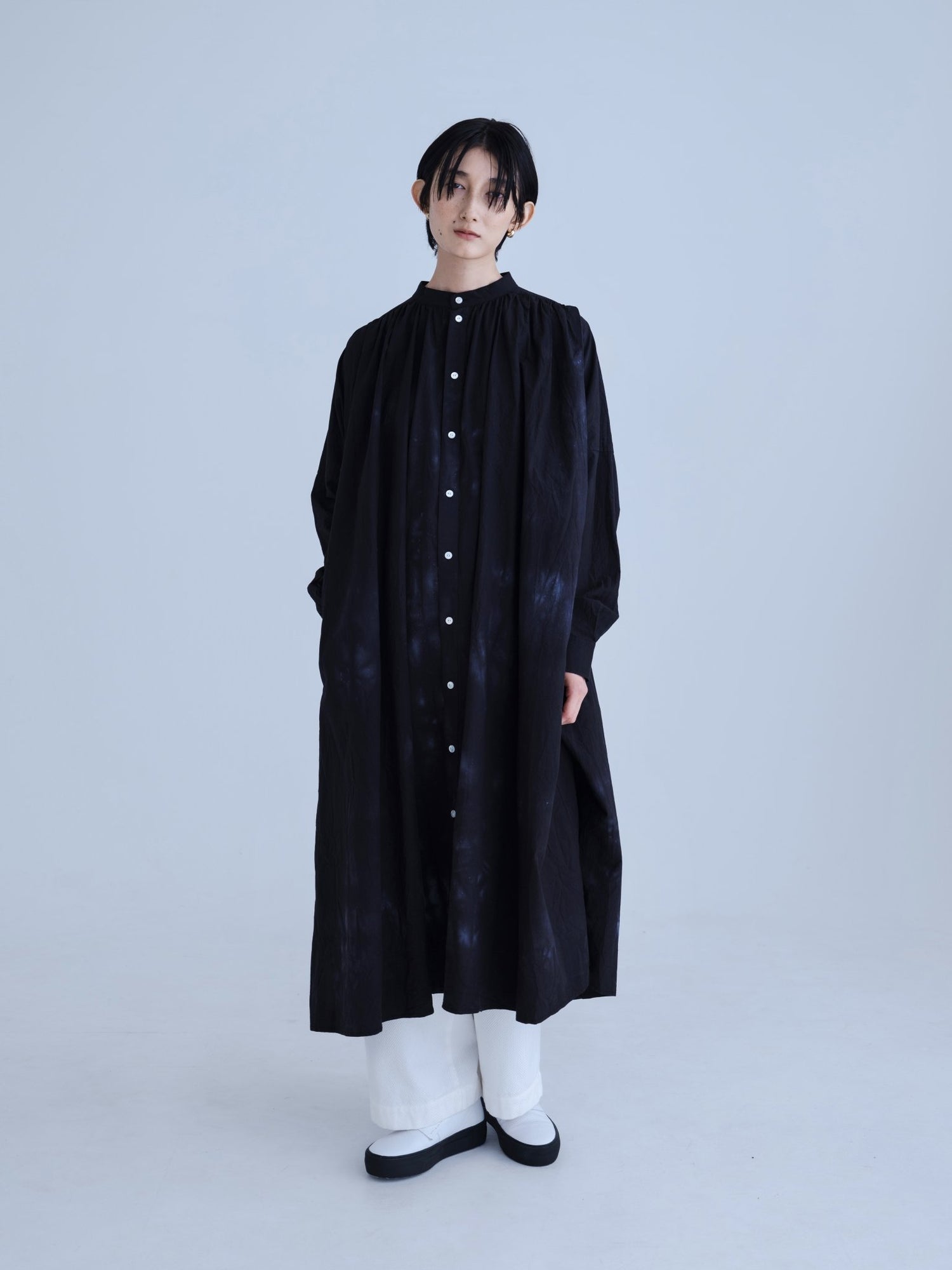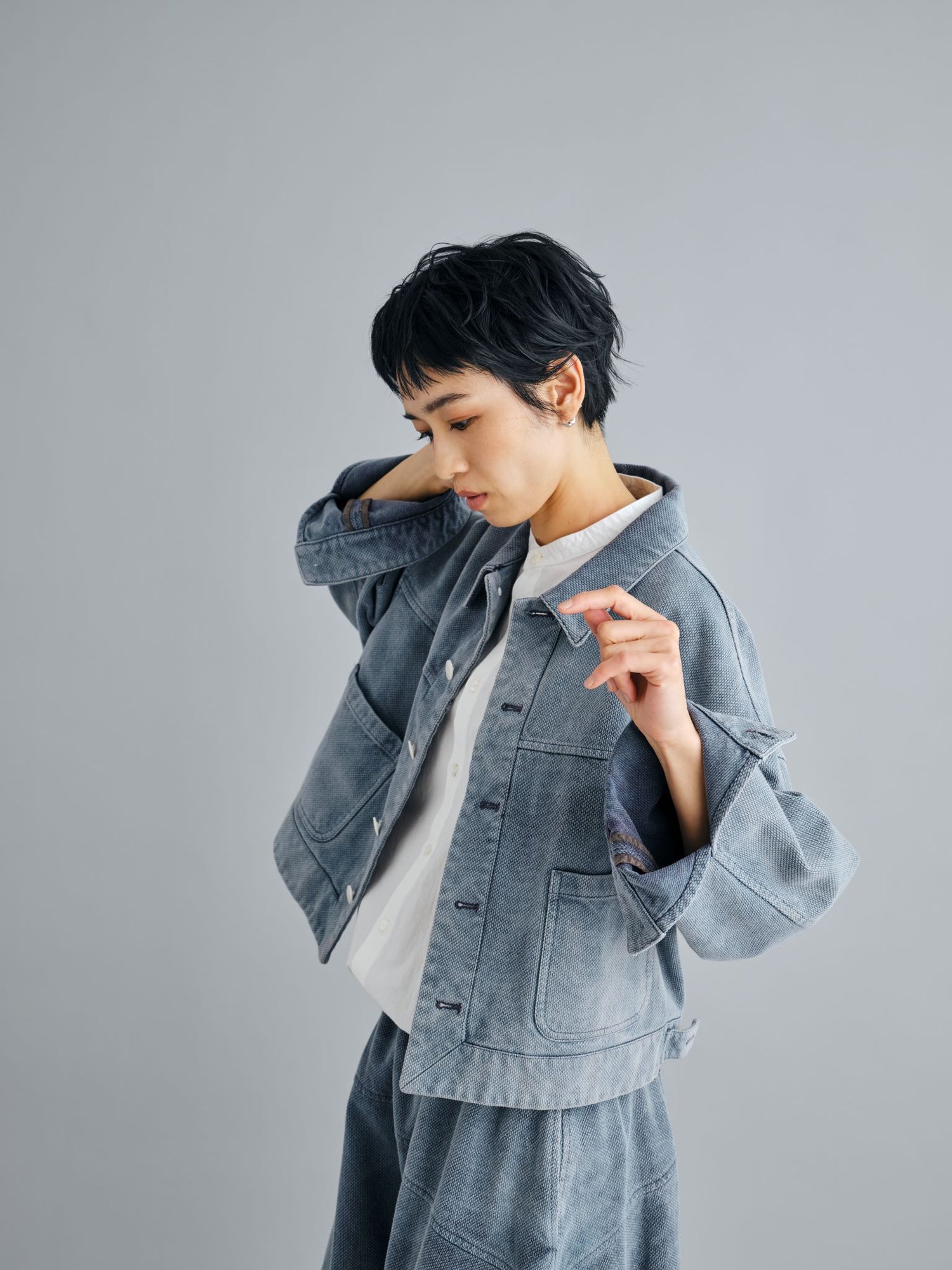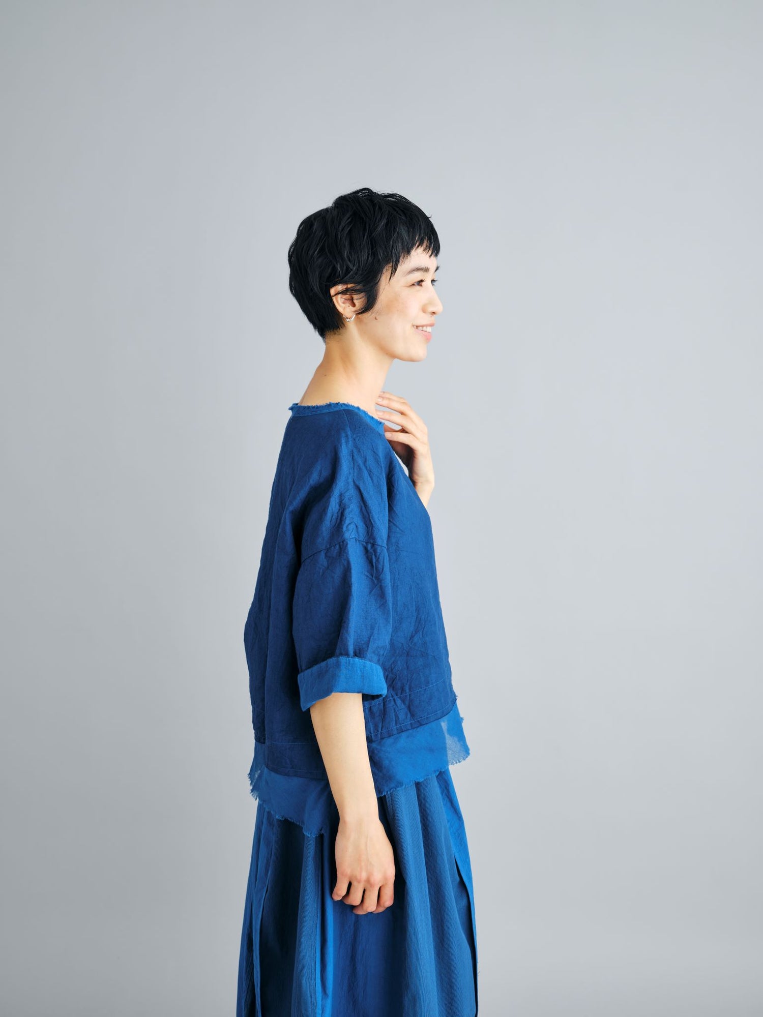 エゴンシーレ 『小さな街3』オーストリアの画家・エゴンシーレの作品『小さな街3』からインスピレーションを受けて、今期のカラーと染色方法を作成。エゴンシーレの絵画に見られる特徴的なタッチや凹凸感を、「ムラ染め」で表現しました。