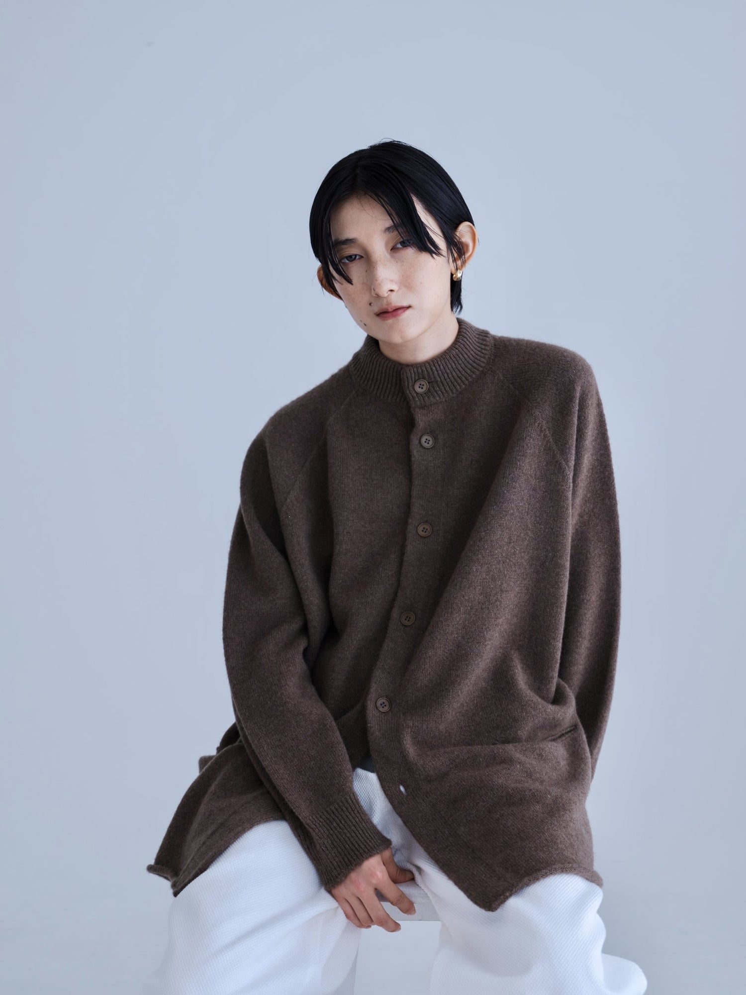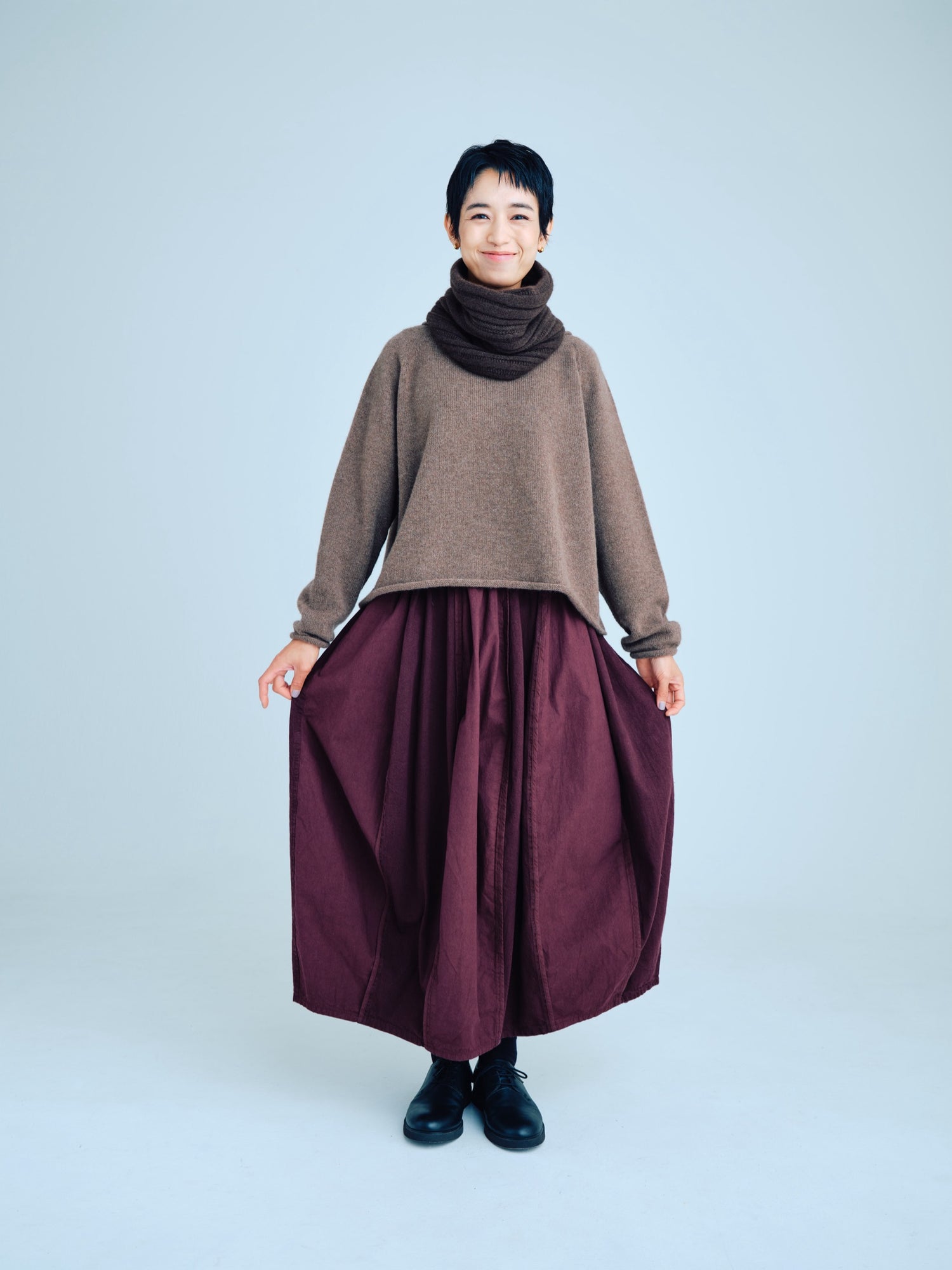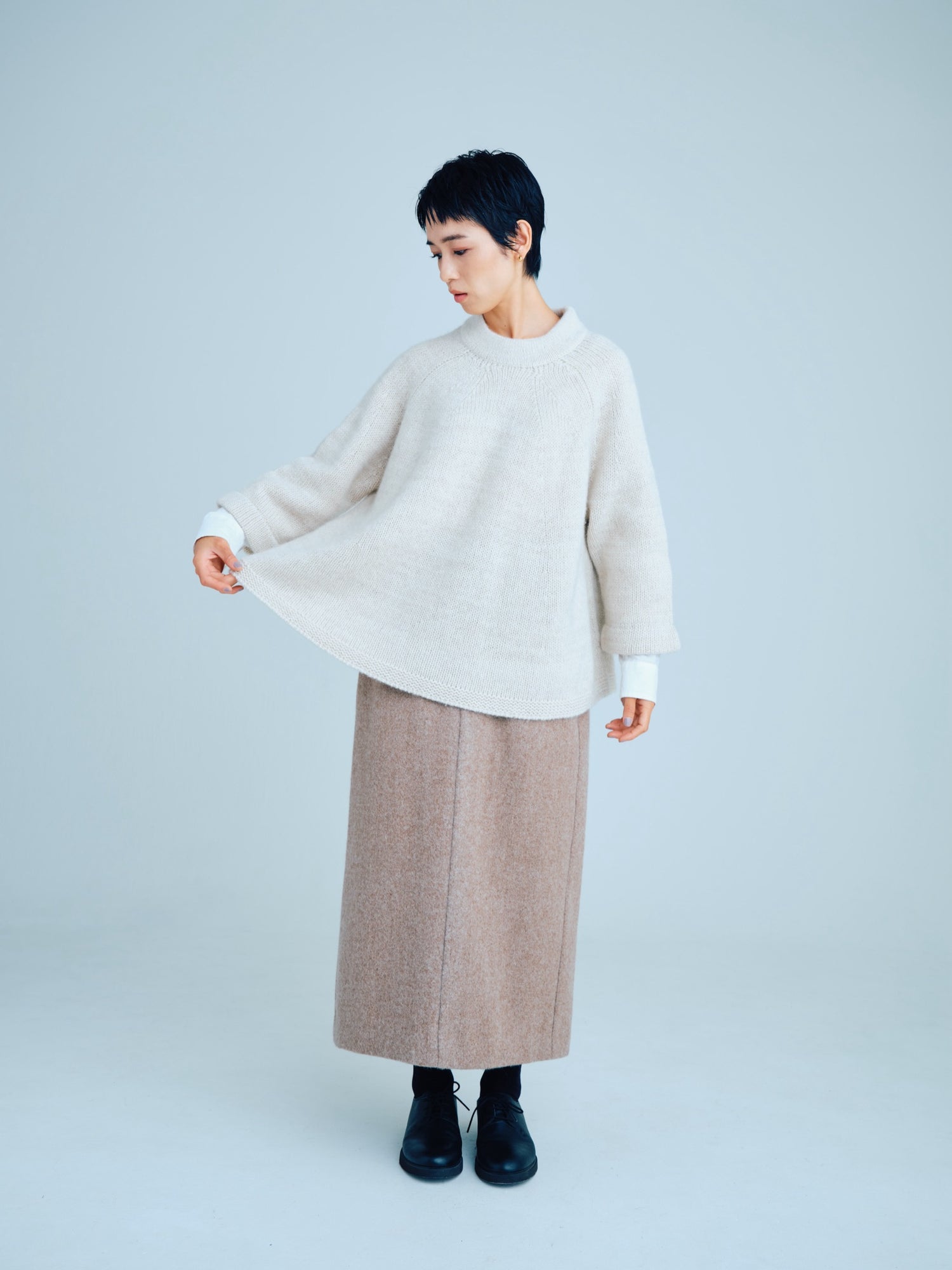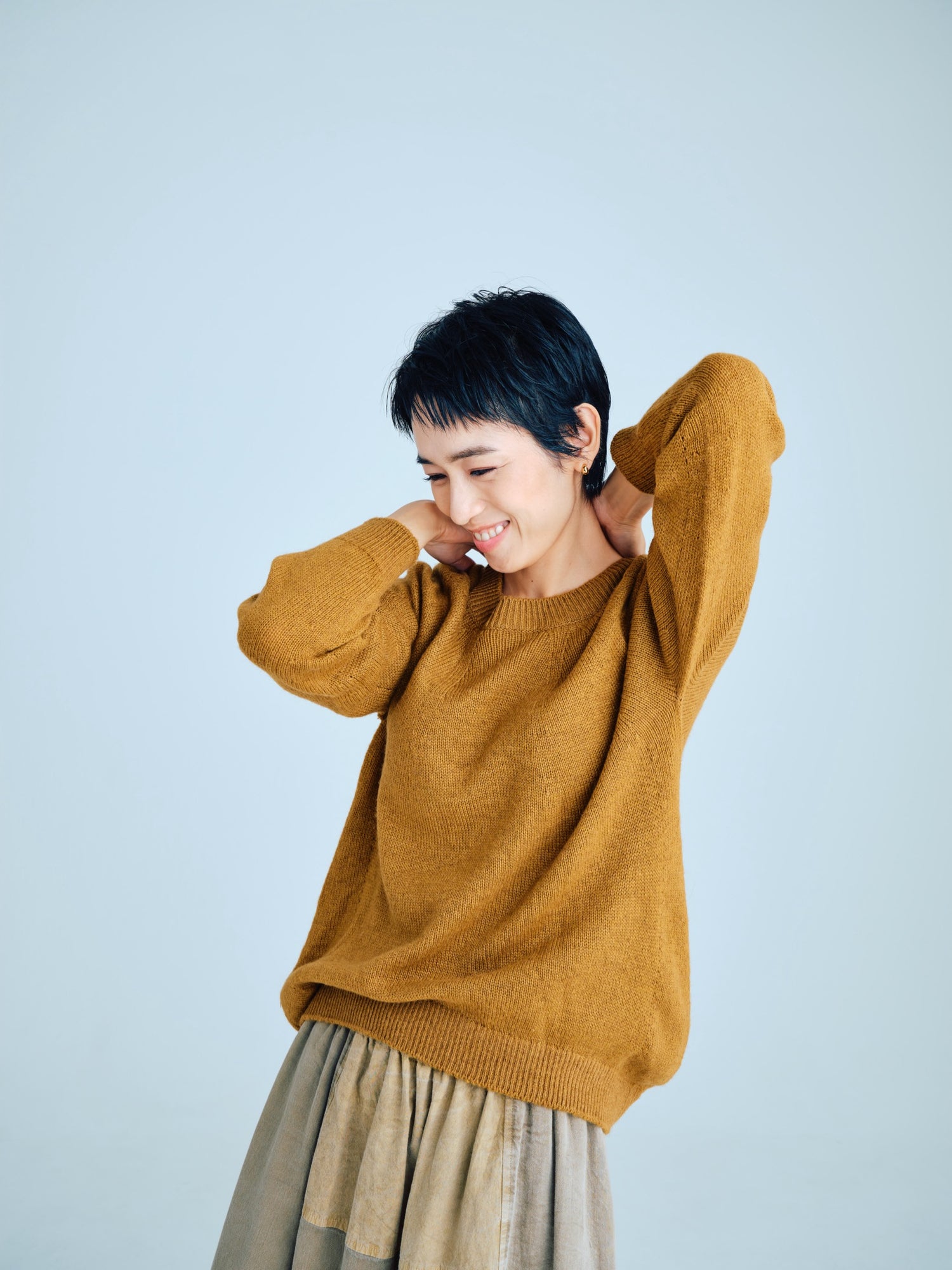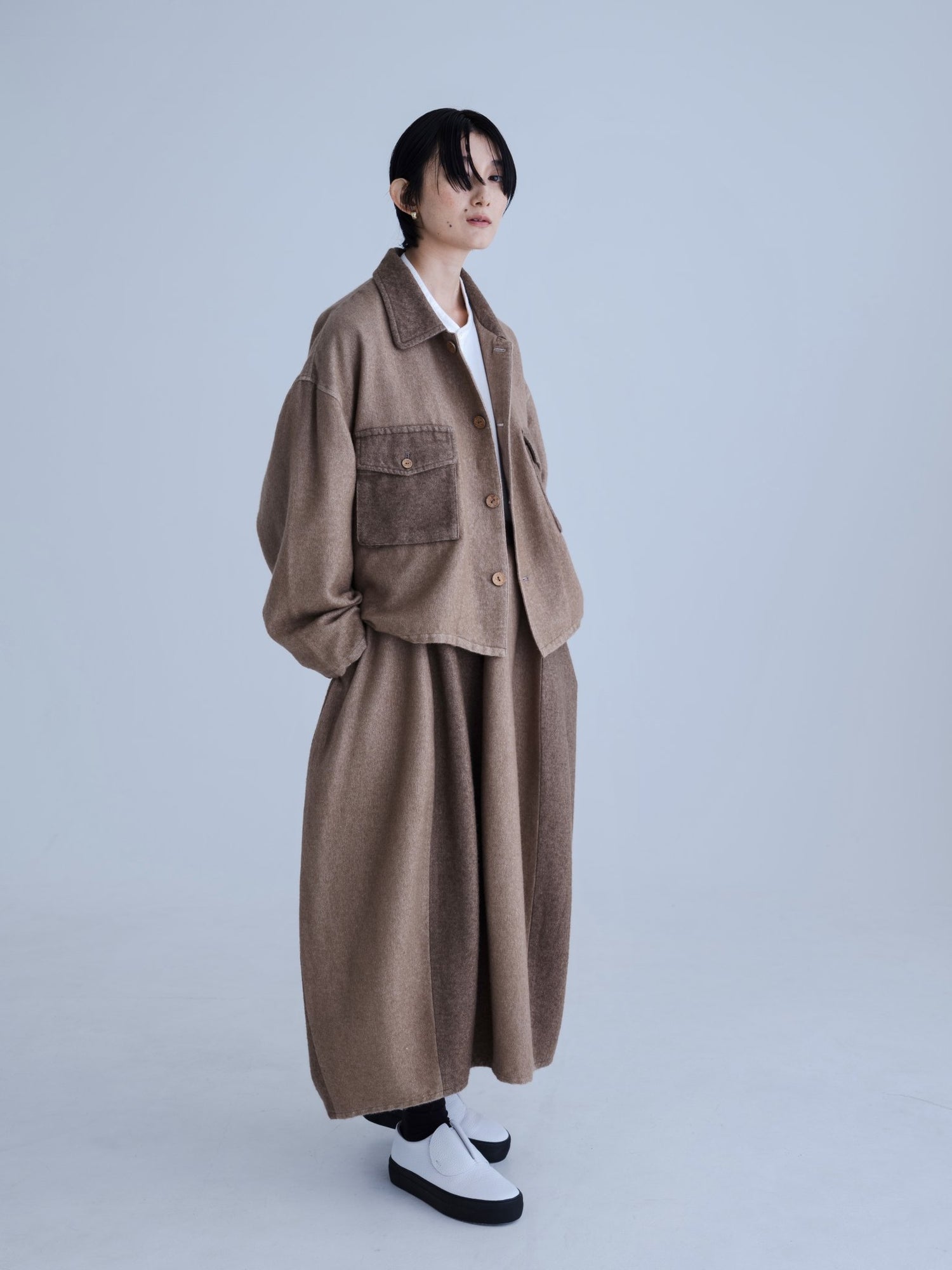 モンゴリアンウール、ヤク、カシミヤ、キャメル など、モンゴルの大自然でのびのび育った動物たちの原毛を、ニットはもちろん、布帛にも贅沢に使用しました。モンゴリアンウールの良さを存分に感じてもらえるよう、初秋から活躍する薄手から、真冬まであたたかくお過ごしいただけるような、ふっくらとしたウール素材まで幅広くご用意しました。ウール素材には起毛加工を施し、見た目からもあたたかさを感じていただけるようにお作りしています。