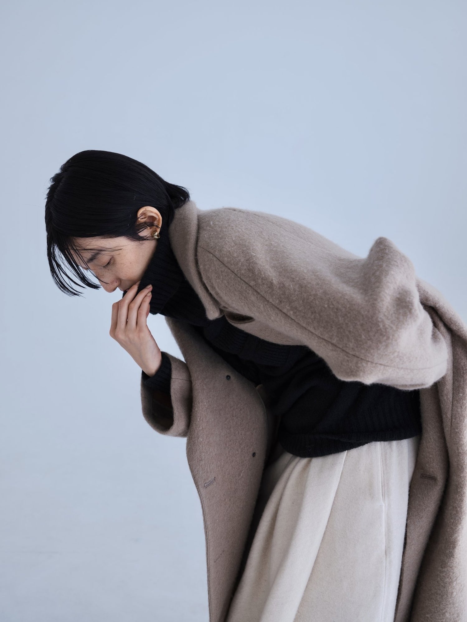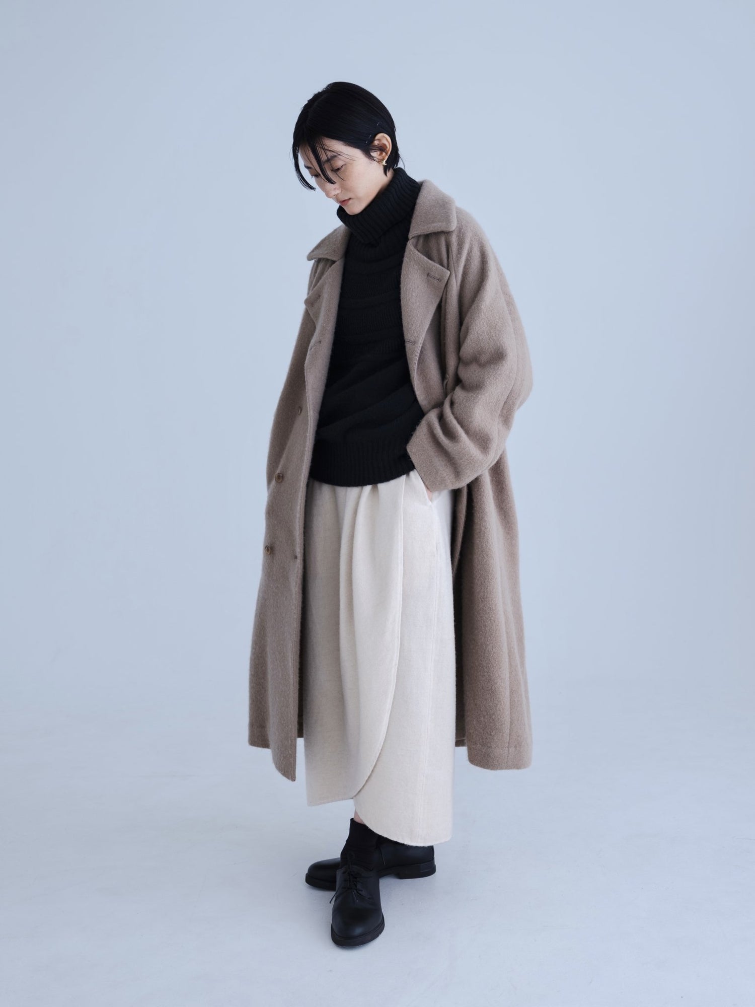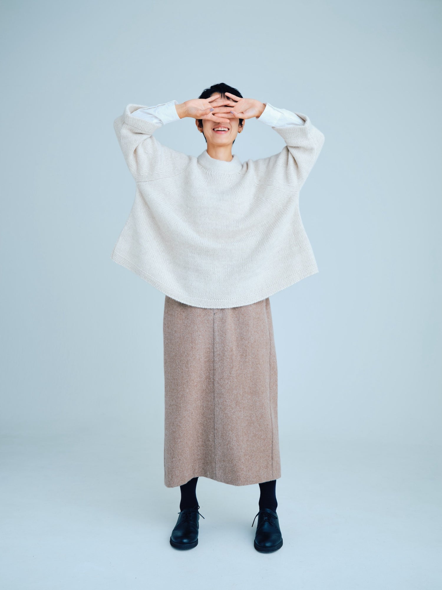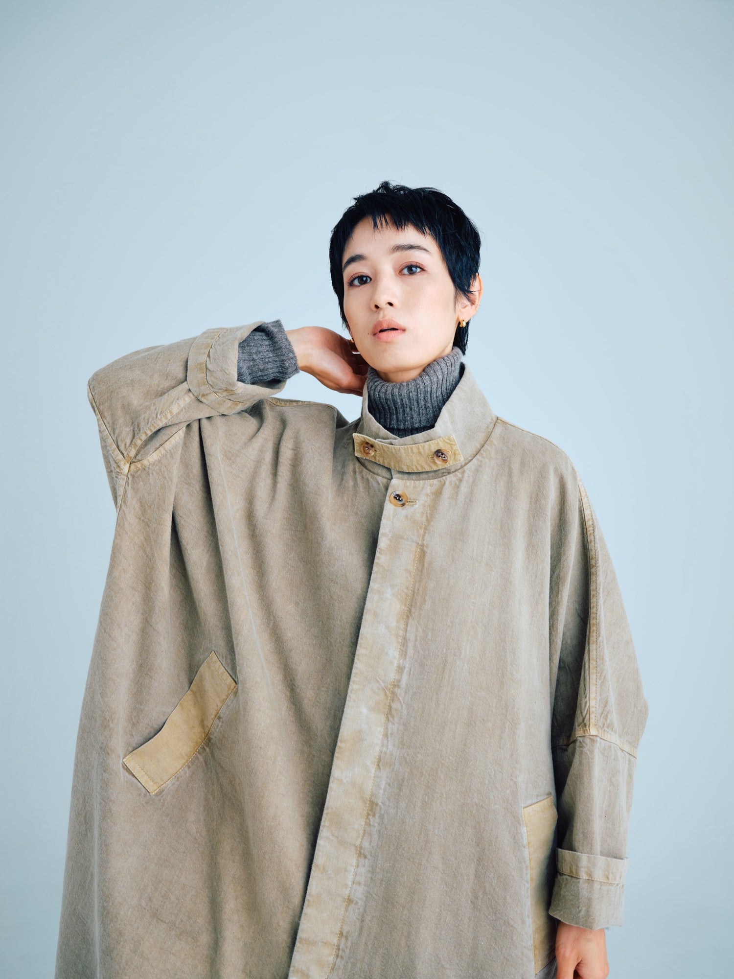 モンゴリアンウール、ヤク、カシミヤ、キャメル など、モンゴルの大自然でのびのび育った動物たちの原毛を、ニットはもちろん、布帛にも贅沢に使用しました。モンゴリアンウールの良さを存分に感じてもらえるよう、初秋から活躍する薄手から、真冬まであたたかくお過ごしいただけるような、ふっくらとしたウール素材まで幅広くご用意しました。ウール素材には起毛加工を施し、見た目からもあたたかさを感じていただけるようにお作りしています。