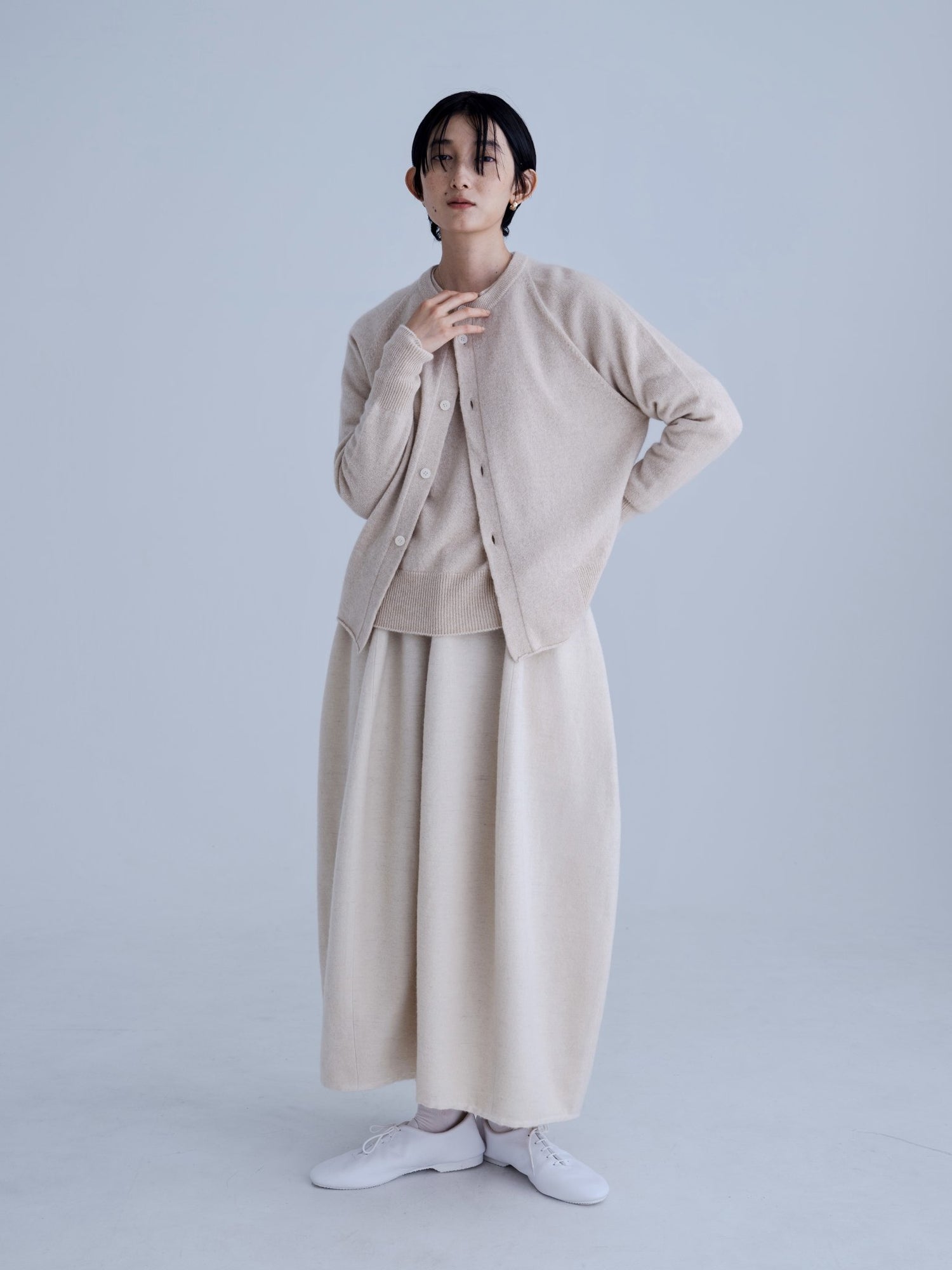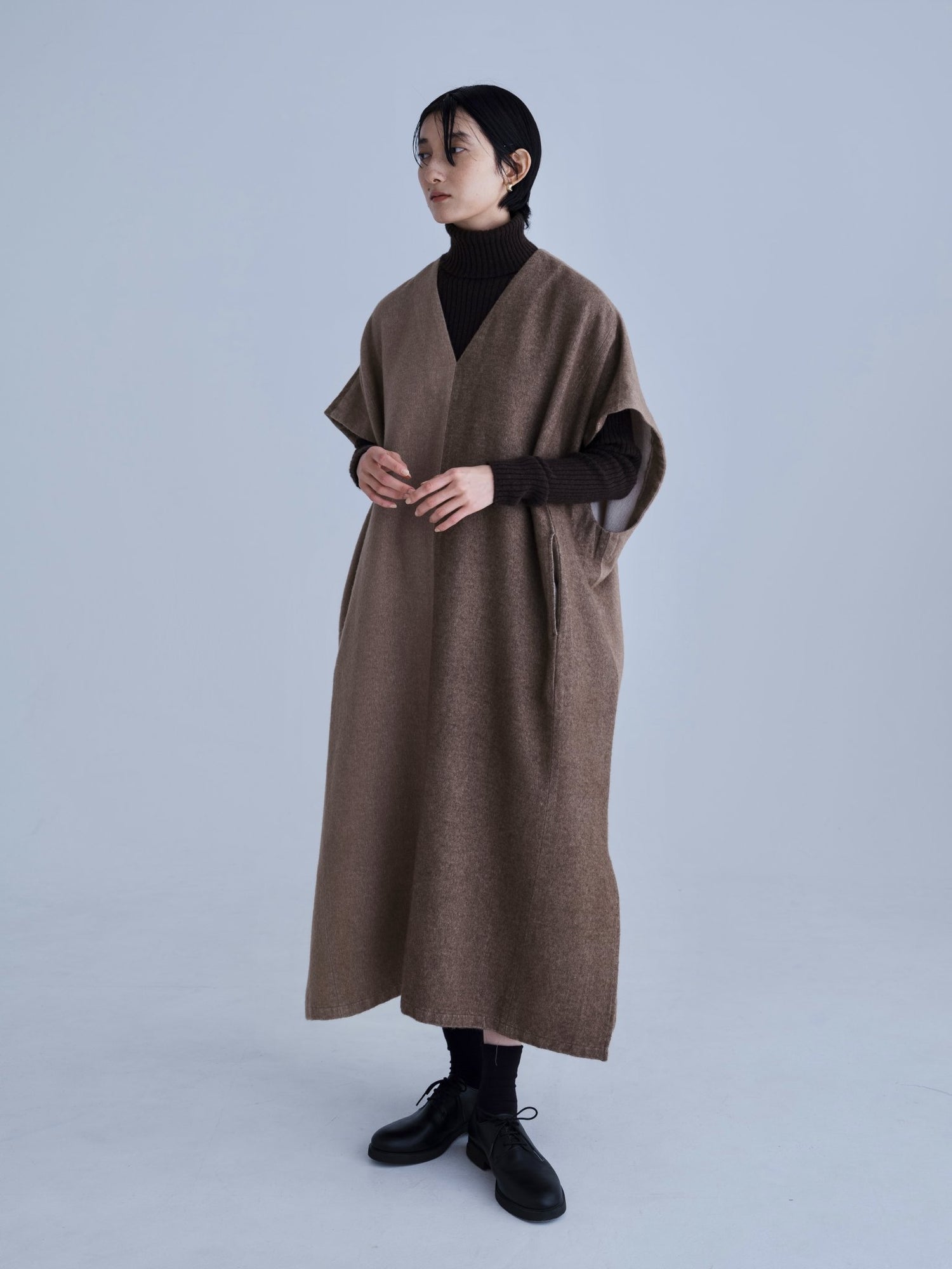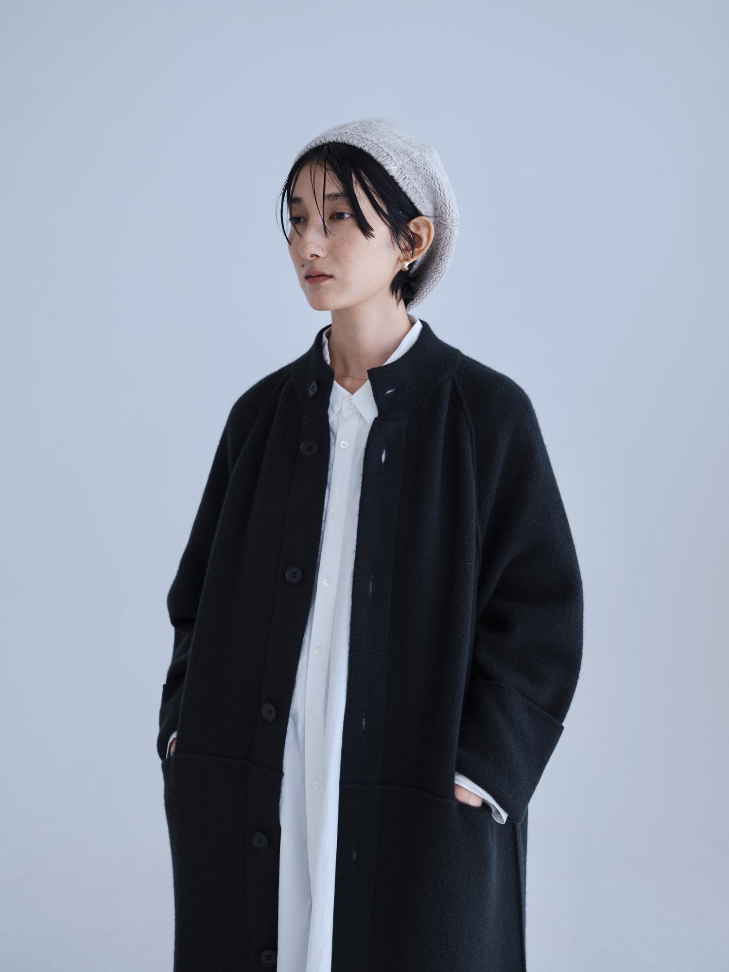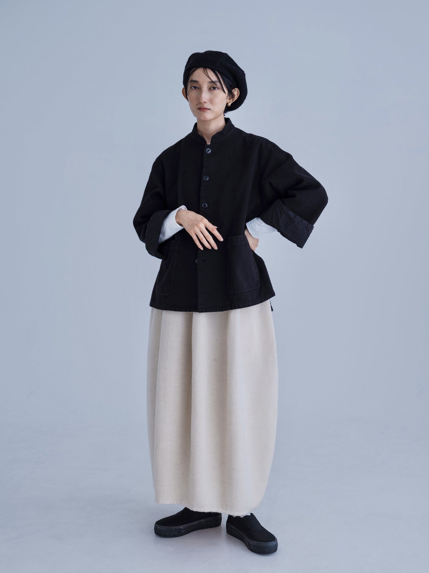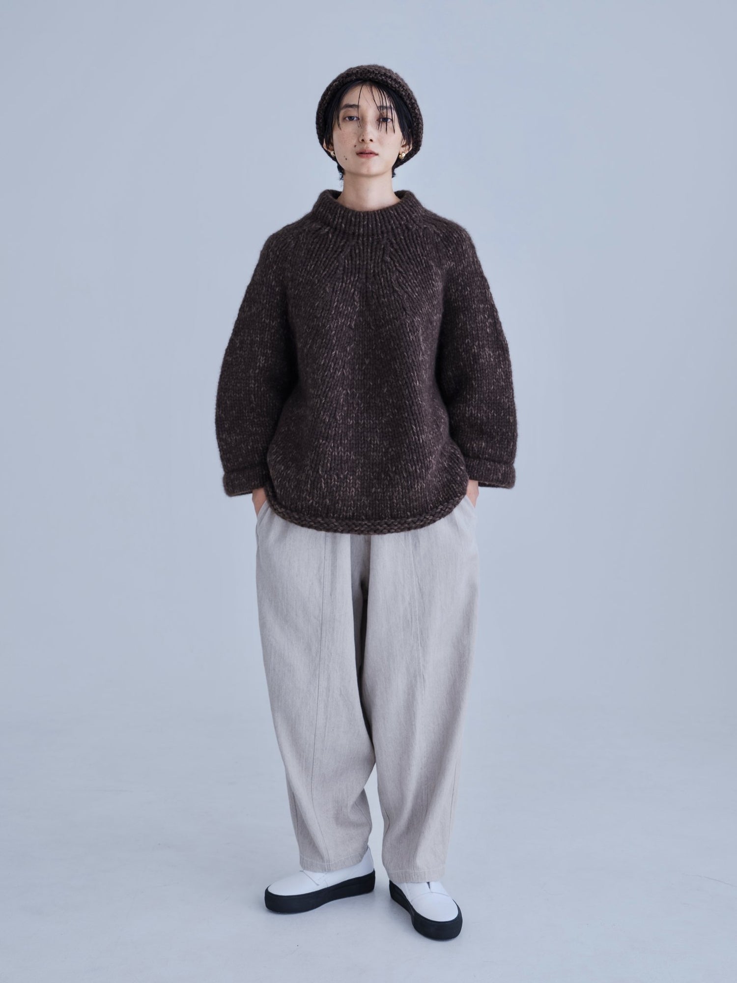 モンゴリアンウール、ヤク、カシミヤ、キャメル など、モンゴルの大自然でのびのび育った動物たちの原毛を、ニットはもちろん、布帛にも贅沢に使用しました。モンゴリアンウールの良さを存分に感じてもらえるよう、初秋から活躍する薄手から、真冬まであたたかくお過ごしいただけるような、ふっくらとしたウール素材まで幅広くご用意しました。ウール素材には起毛加工を施し、見た目からもあたたかさを感じていただけるようにお作りしています。
