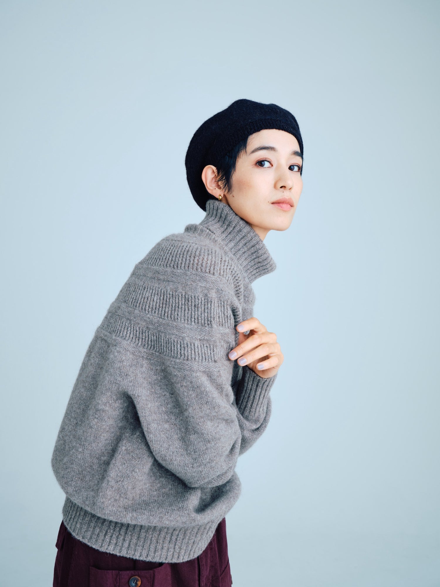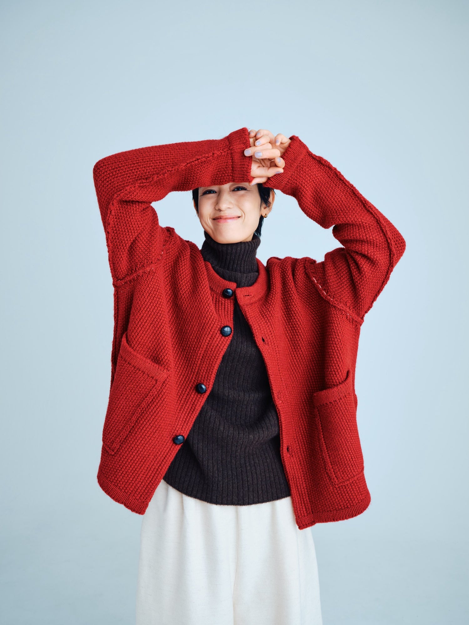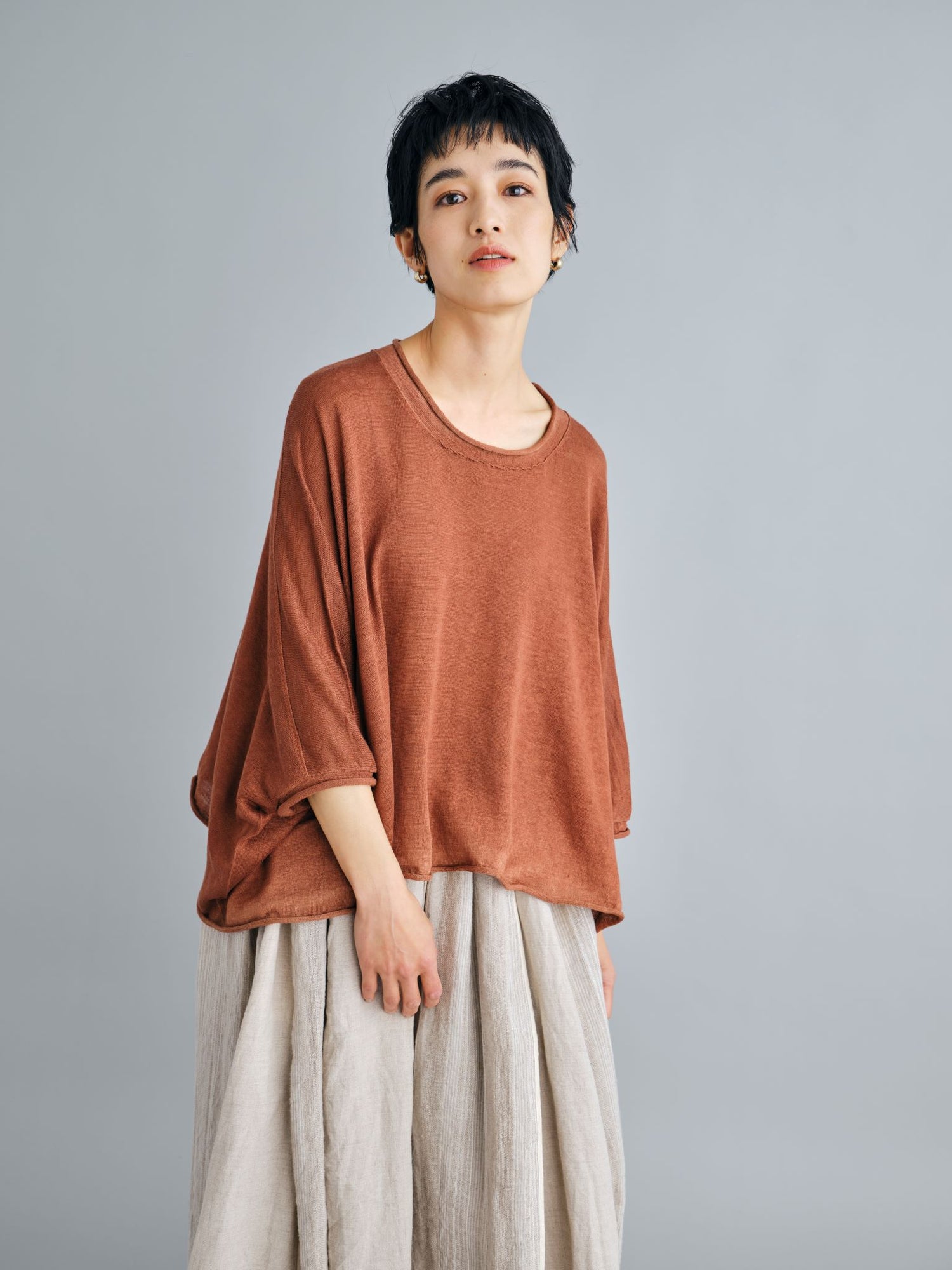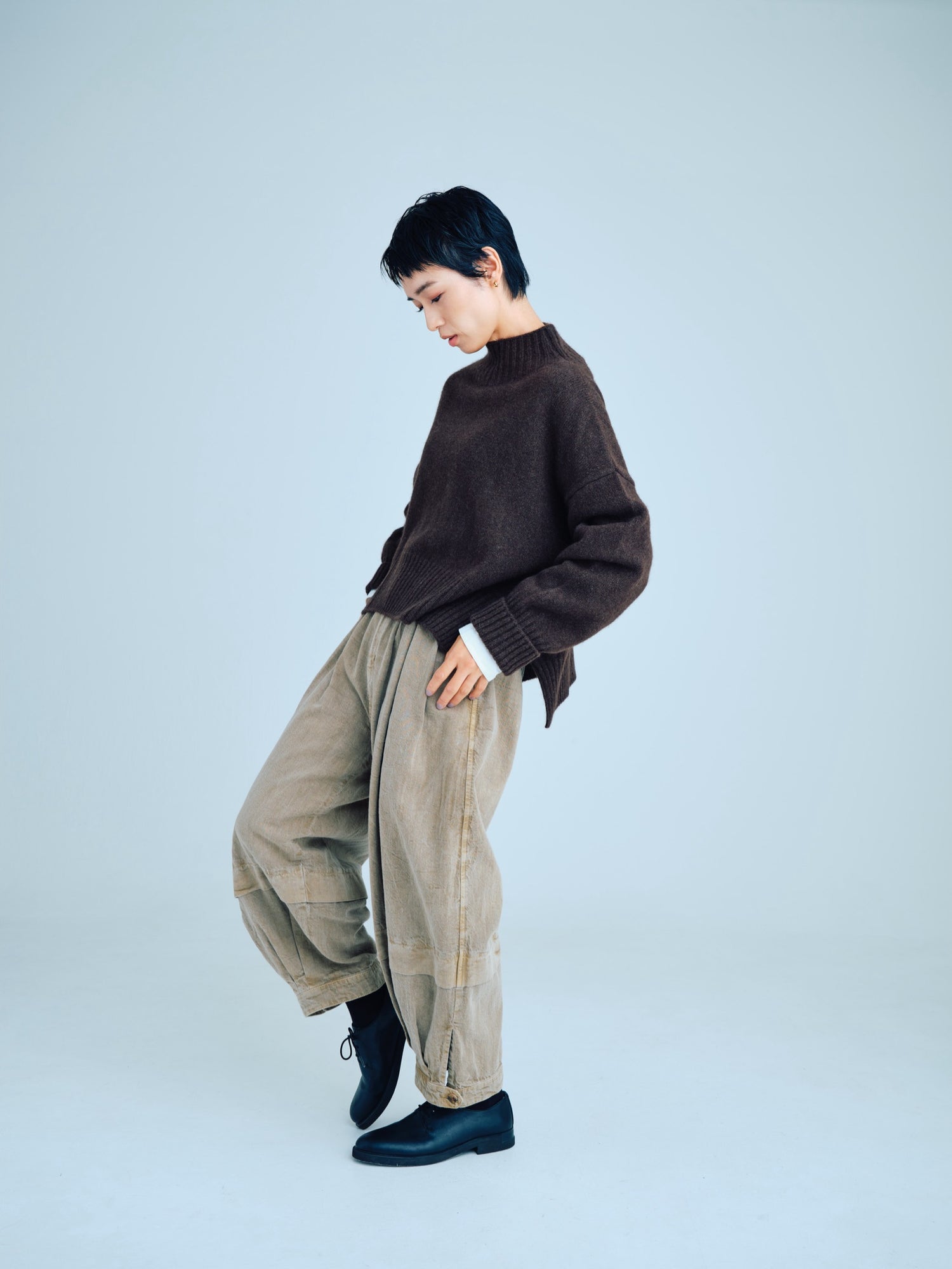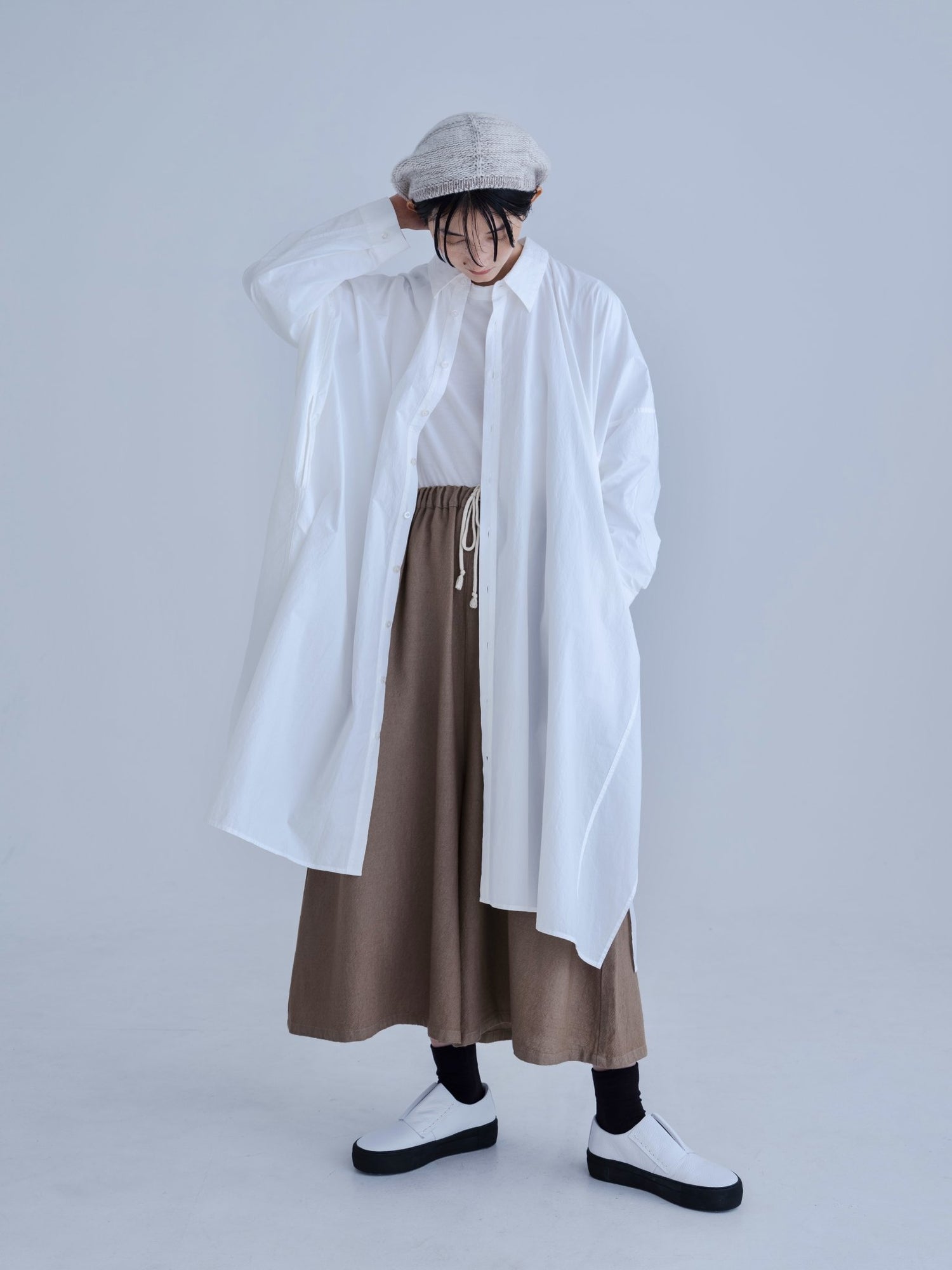 モンゴリアンウール、ヤク、カシミヤ、キャメル など、モンゴルの大自然でのびのび育った動物たちの原毛を、ニットはもちろん、布帛にも贅沢に使用しました。モンゴリアンウールの良さを存分に感じてもらえるよう、初秋から活躍する薄手から、真冬まであたたかくお過ごしいただけるような、ふっくらとしたウール素材まで幅広くご用意しました。ウール素材には起毛加工を施し、見た目からもあたたかさを感じていただけるようにお作りしています。