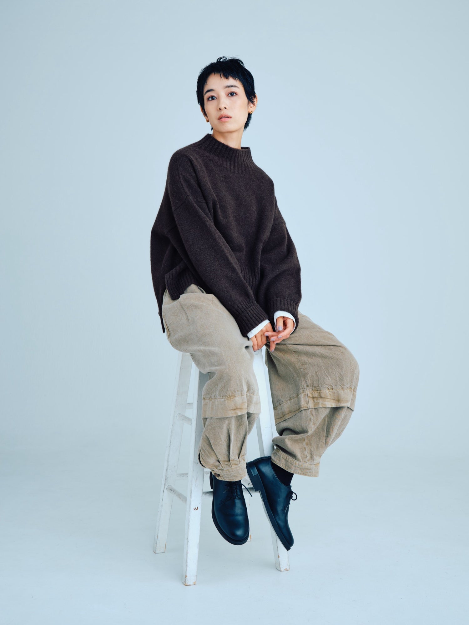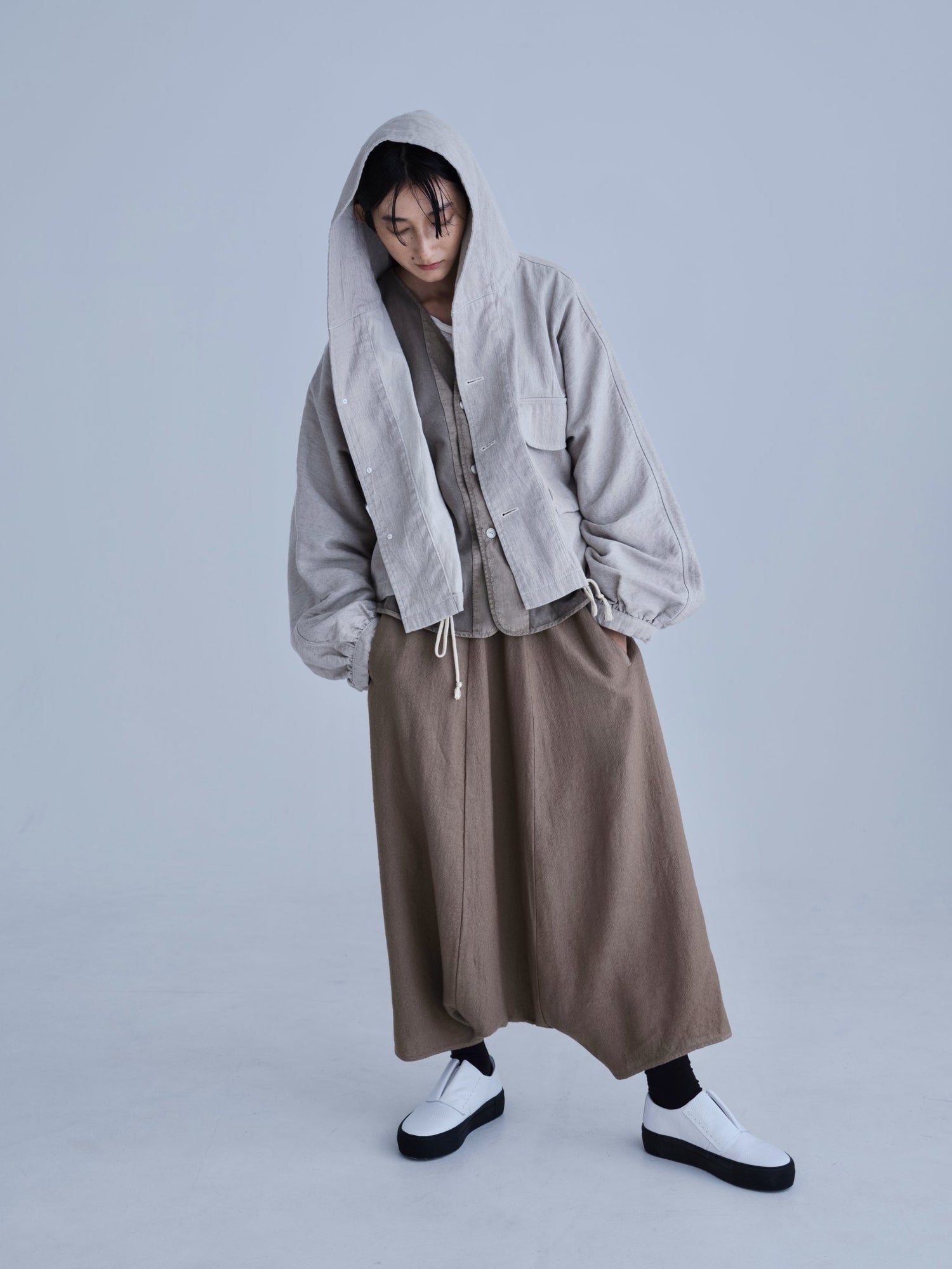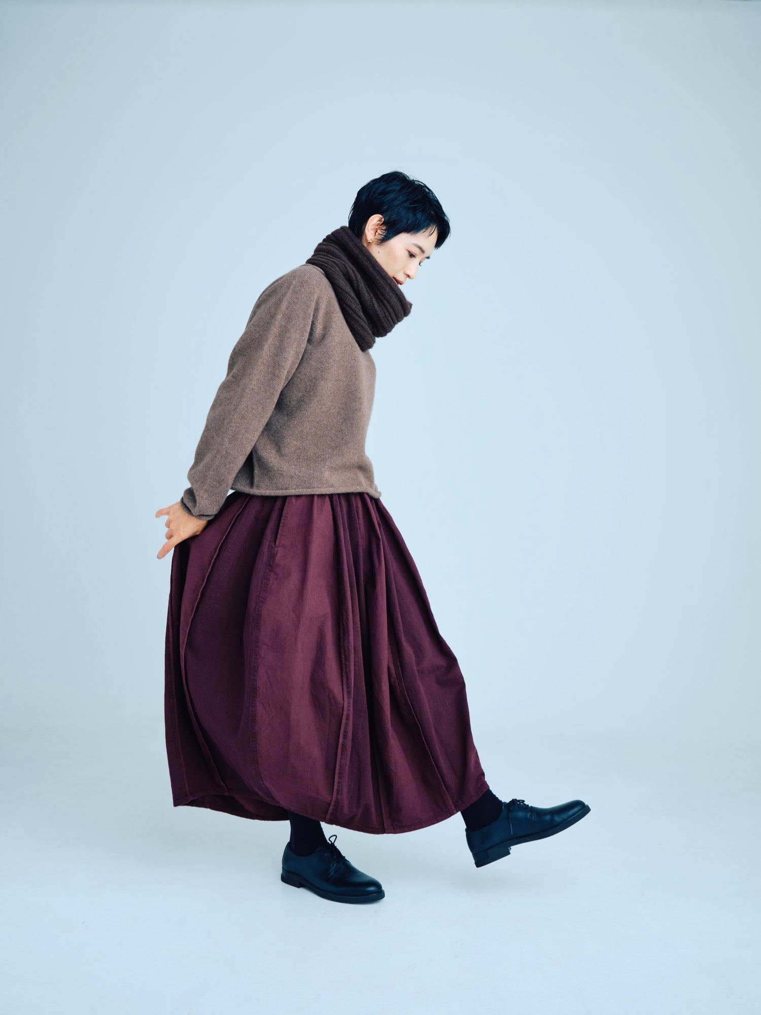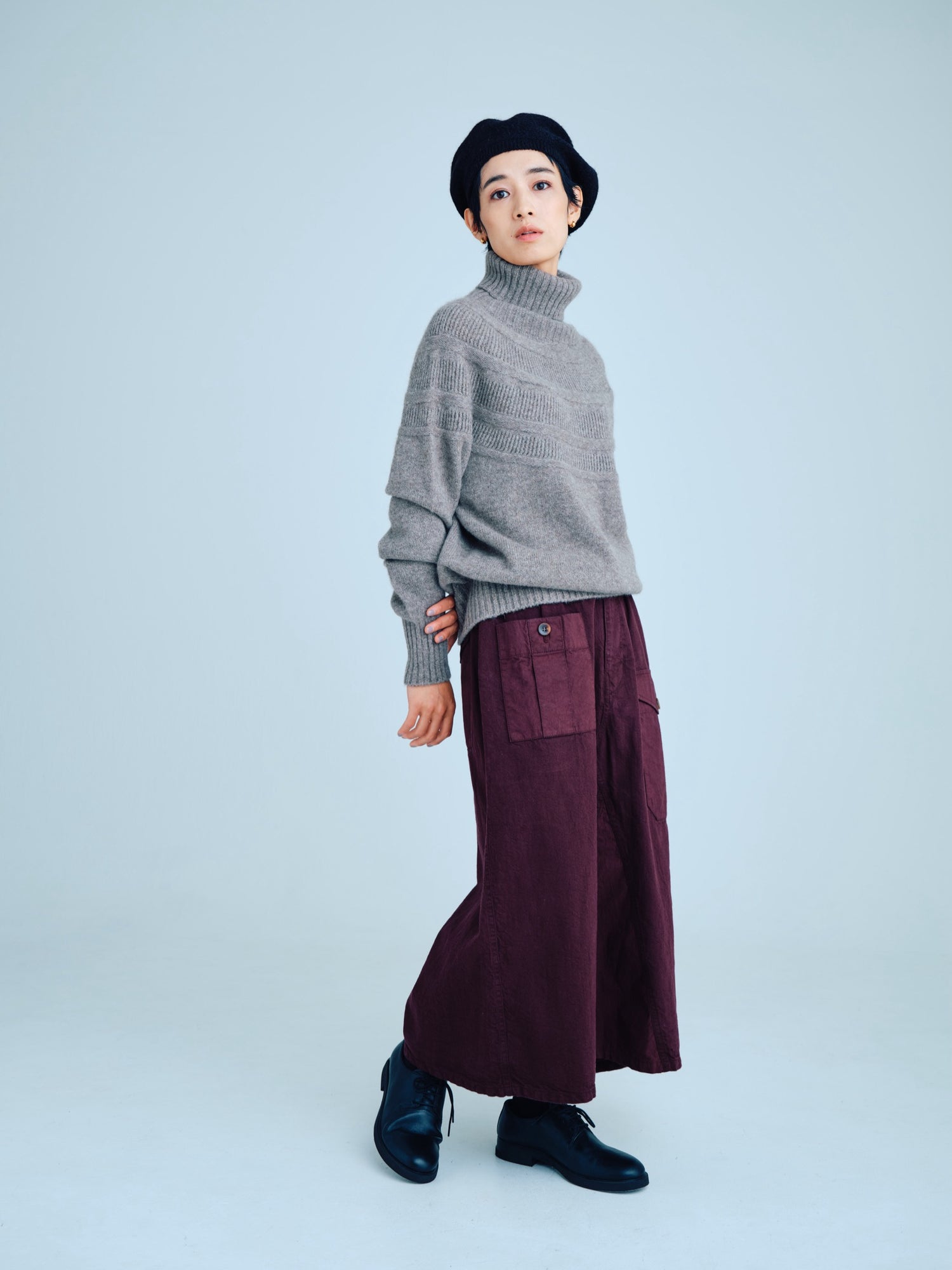 モンゴリアンウール、ヤク、カシミヤ、キャメル など、モンゴルの大自然でのびのび育った動物たちの原毛を、ニットはもちろん、布帛にも贅沢に使用しました。モンゴリアンウールの良さを存分に感じてもらえるよう、初秋から活躍する薄手から、真冬まであたたかくお過ごしいただけるような、ふっくらとしたウール素材まで幅広くご用意しました。ウール素材には起毛加工を施し、見た目からもあたたかさを感じていただけるようにお作りしています。