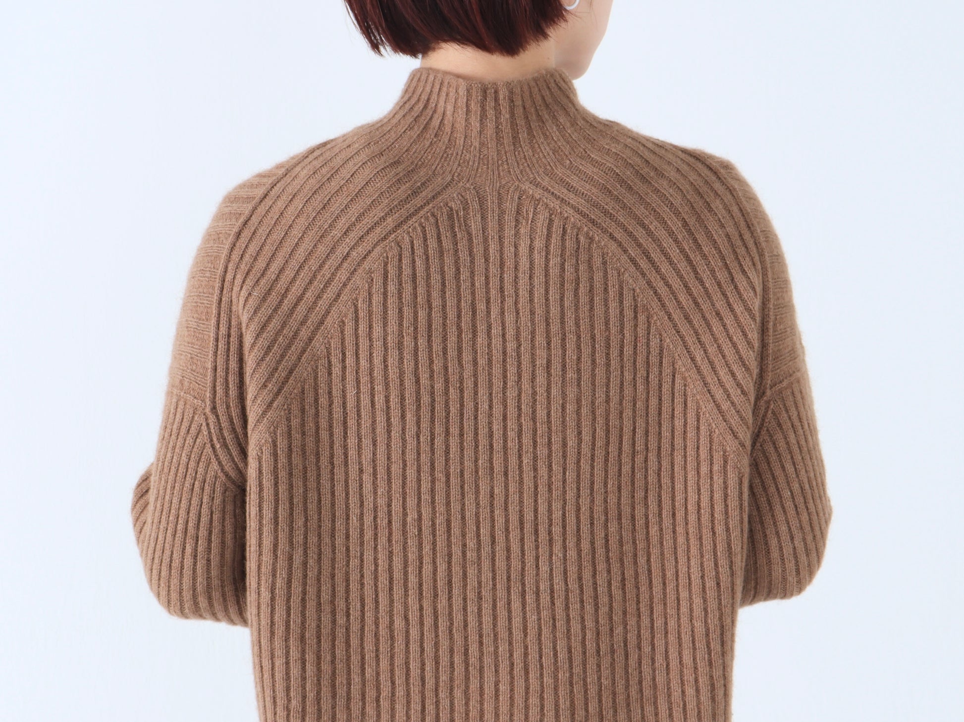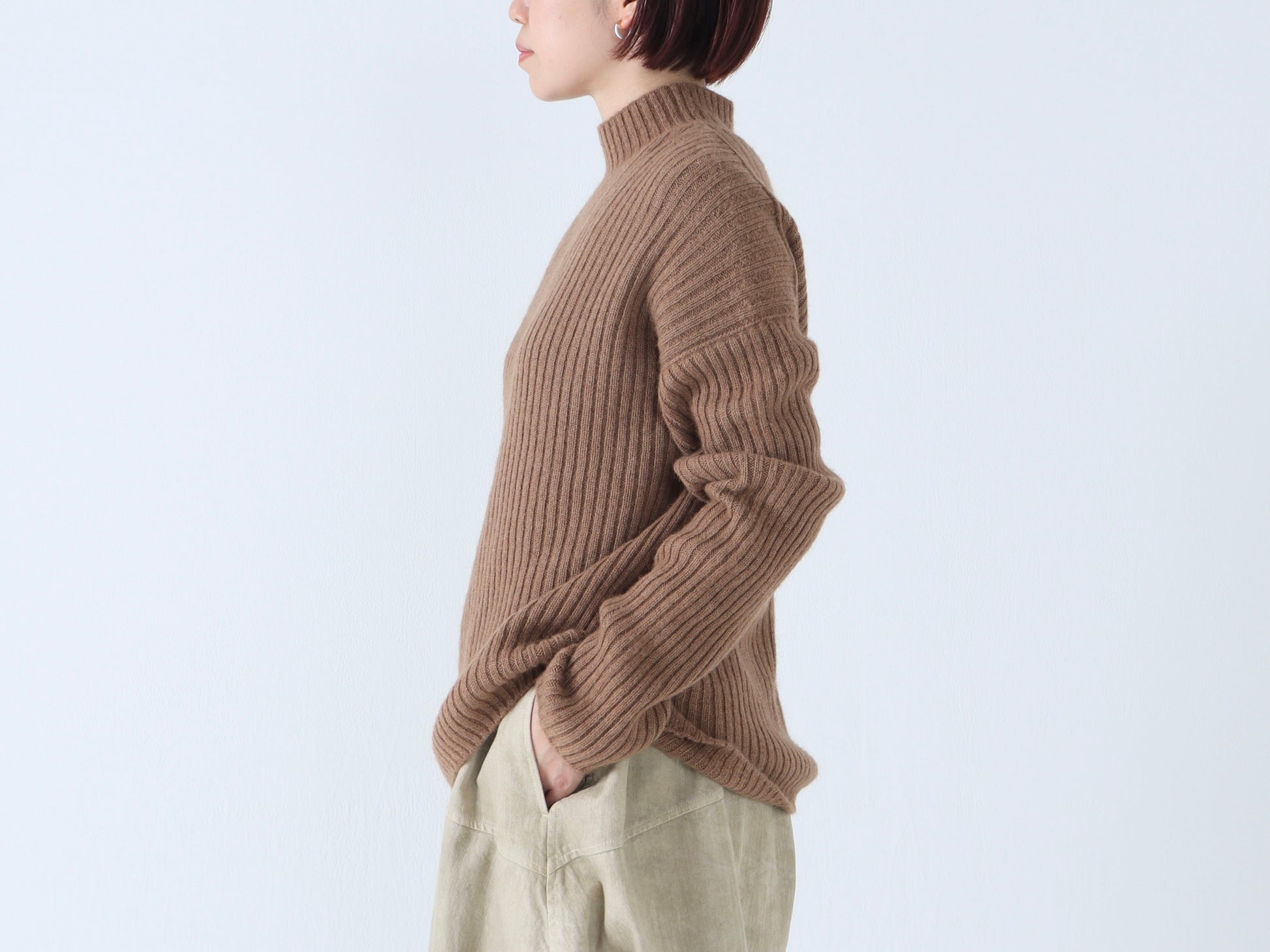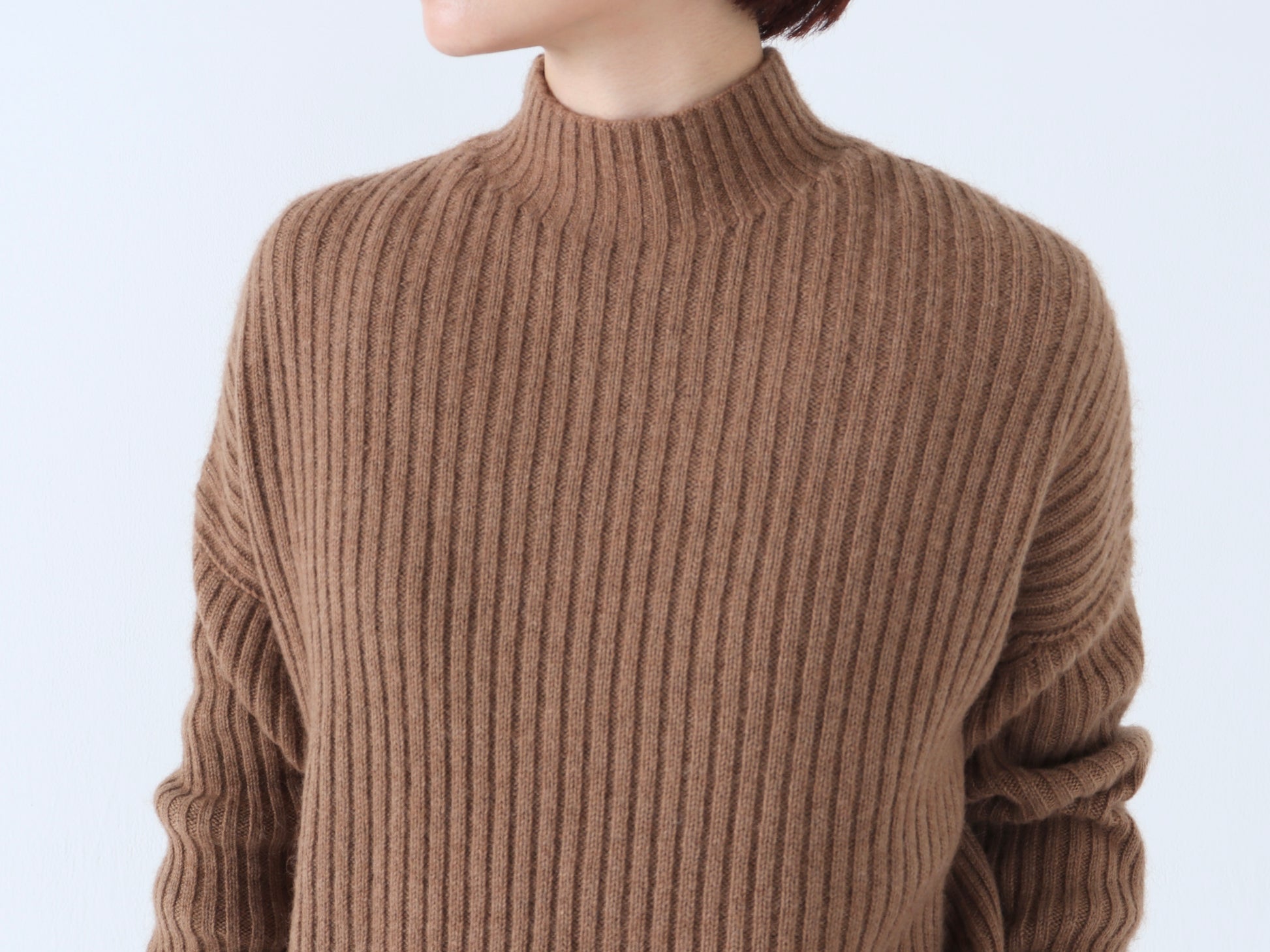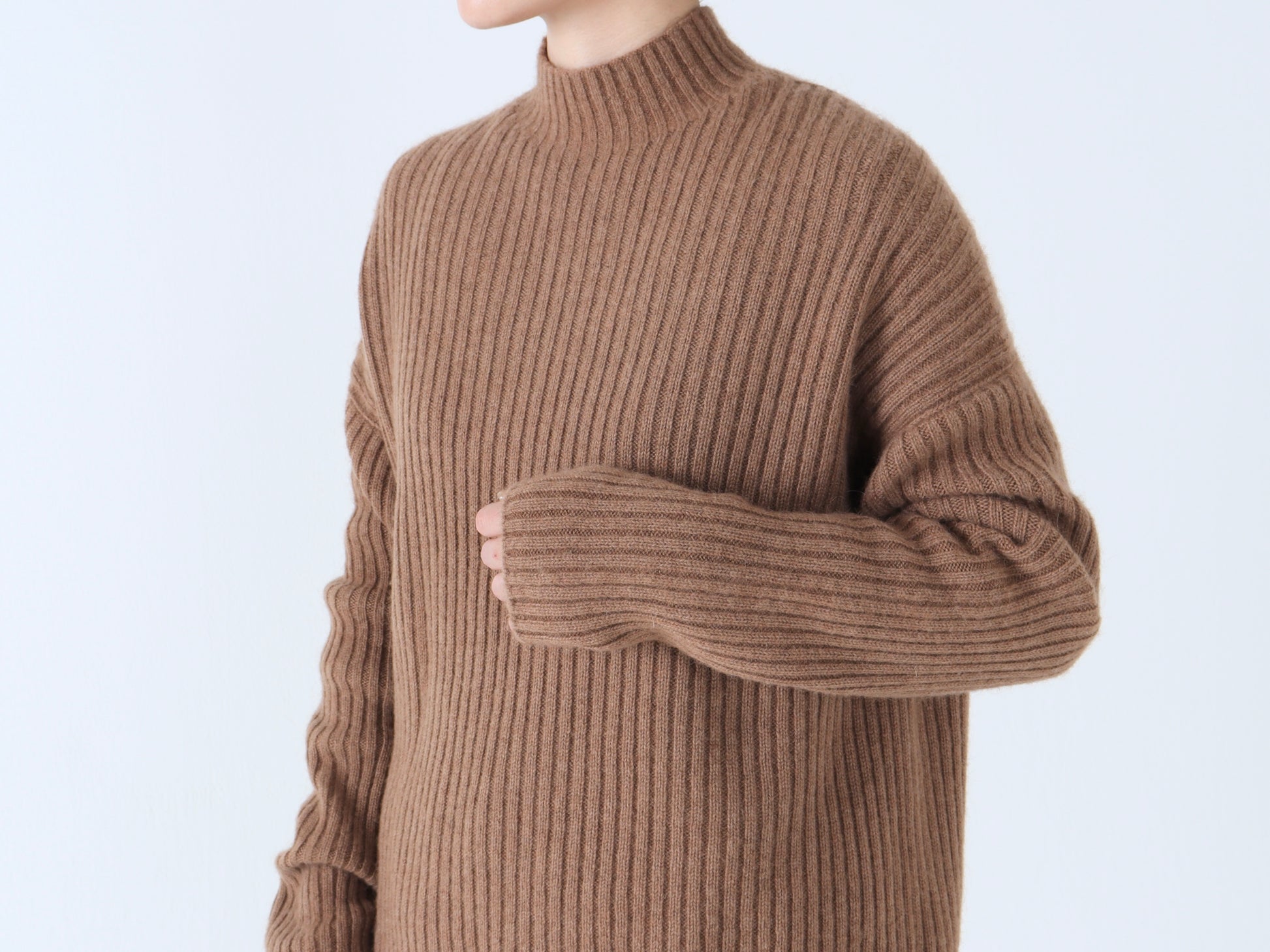 詰まりすぎず程よいフィット感のハイネックは、タートルネックが苦手な方でも取り入れやすいデザインです。