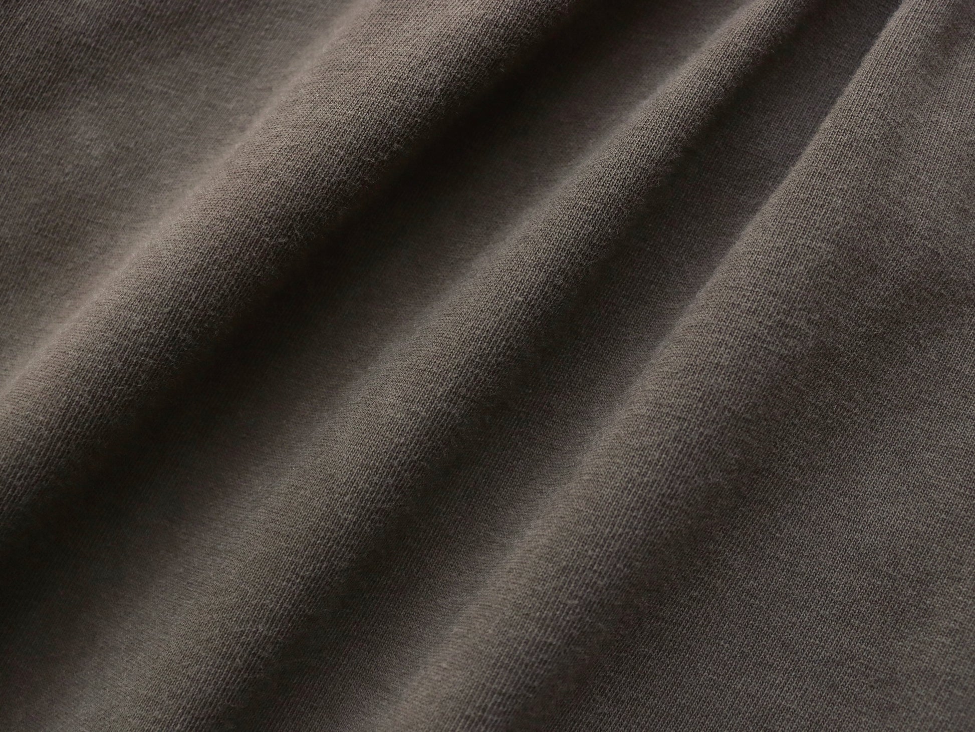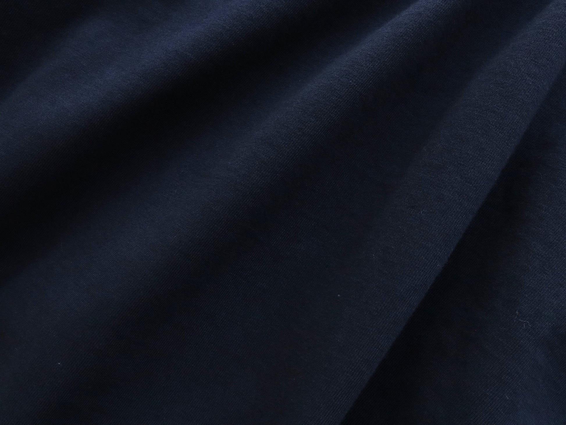 その超長綿を紡いだペルー綿の太番手単糸を、最大限に密度を詰めて編むことで、織り物のようなしっかりとした風合いが生まれます。