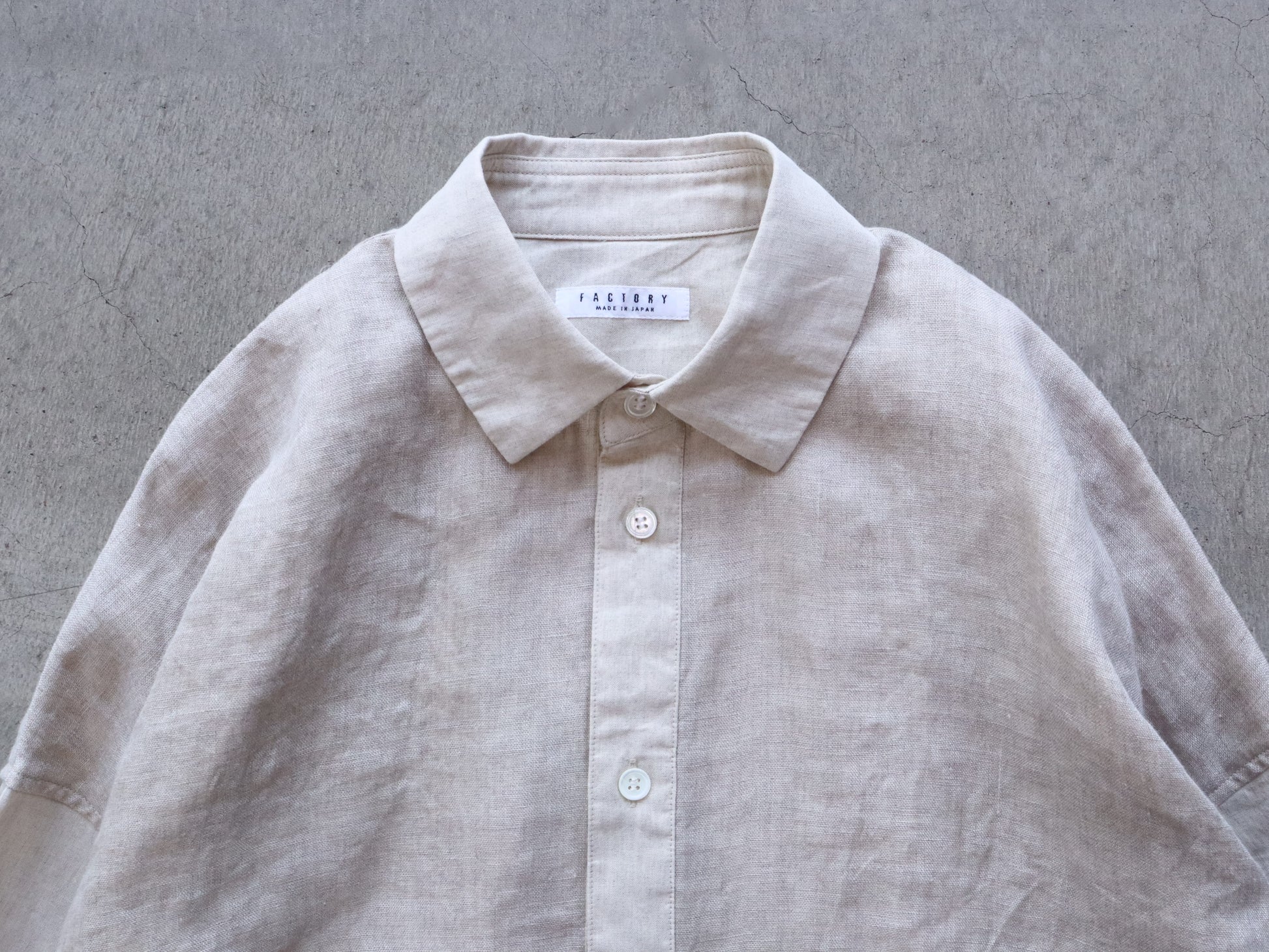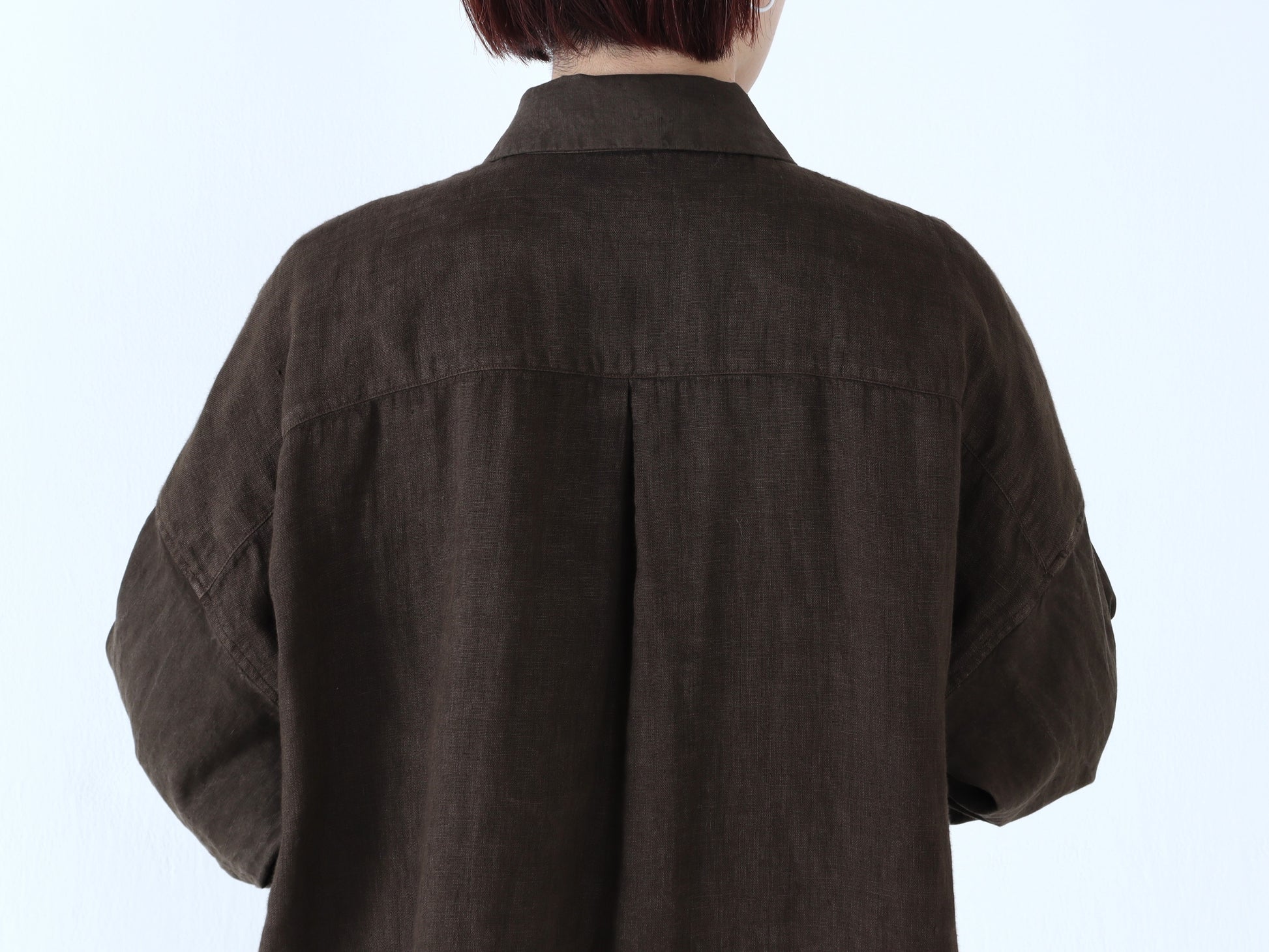 袖には綿麻生地を使い、製品染めによる色のアタリが表情に奥行きを添えます。