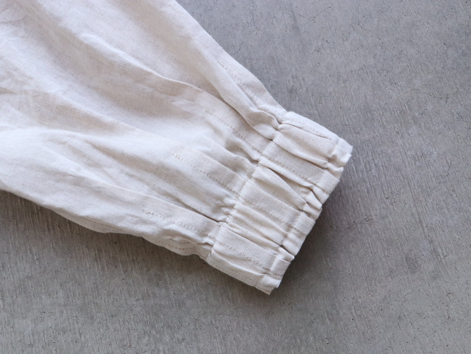 袖口に入れた太めのゴムが自然なギャザーを作りながら、家事や日常で腕をまくるシーンにも快適に対応。