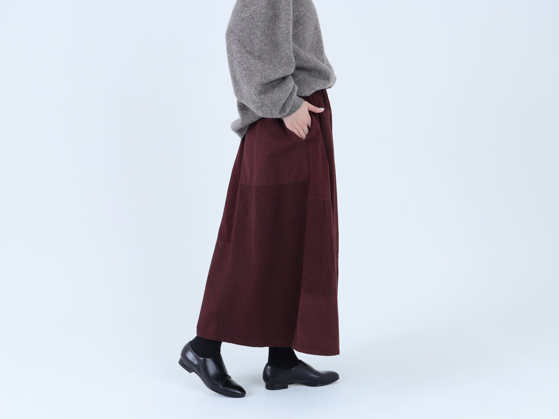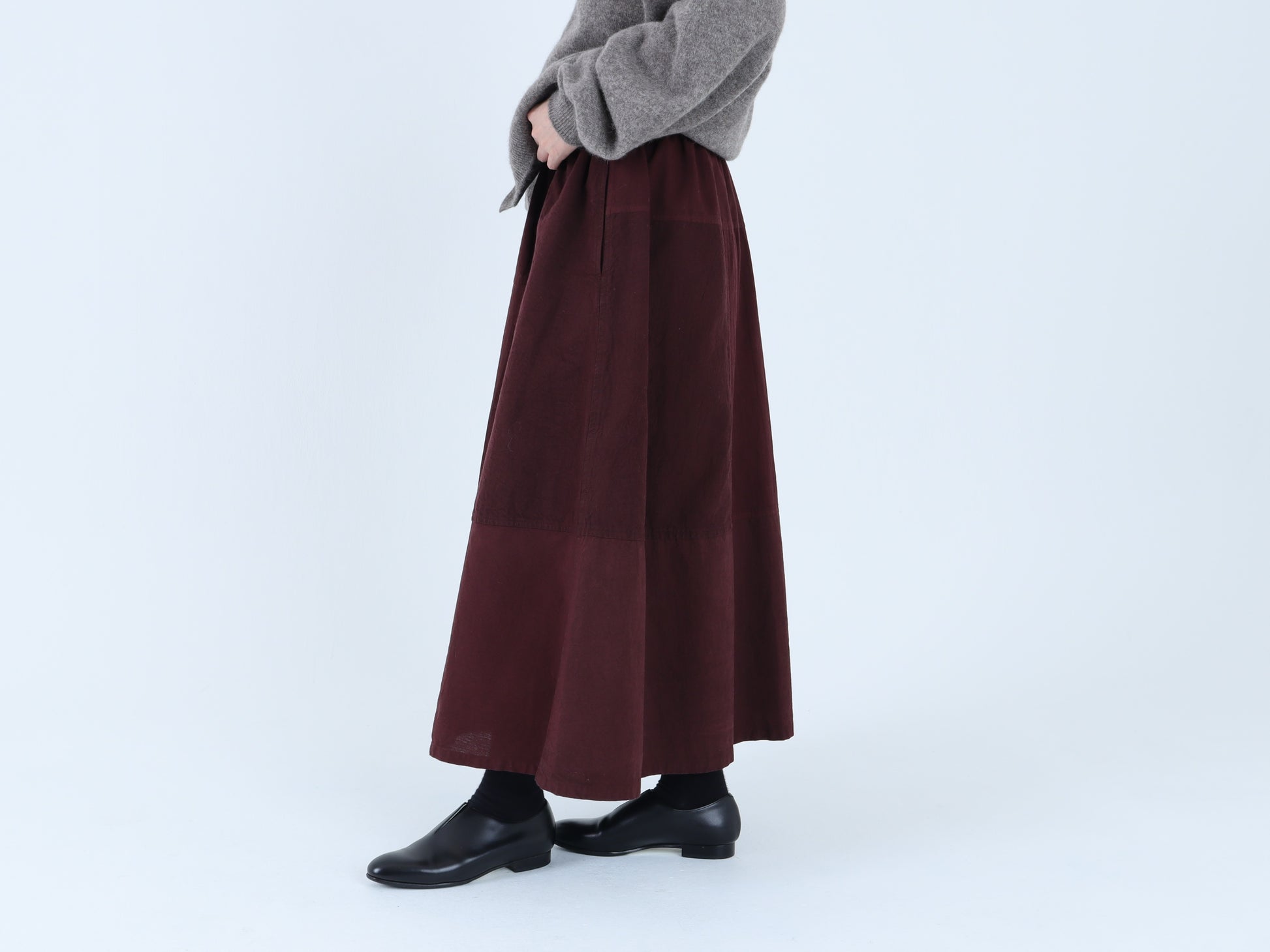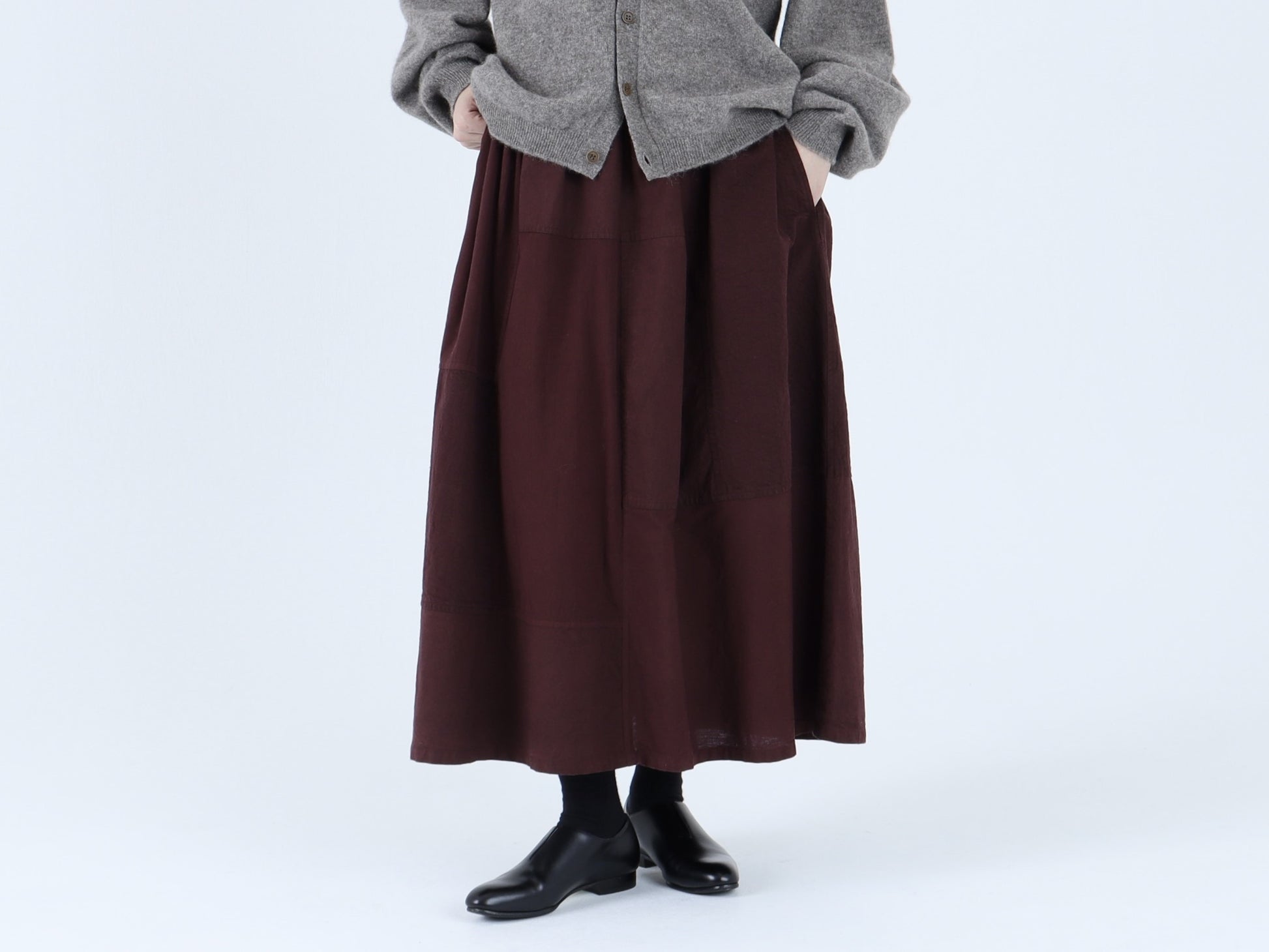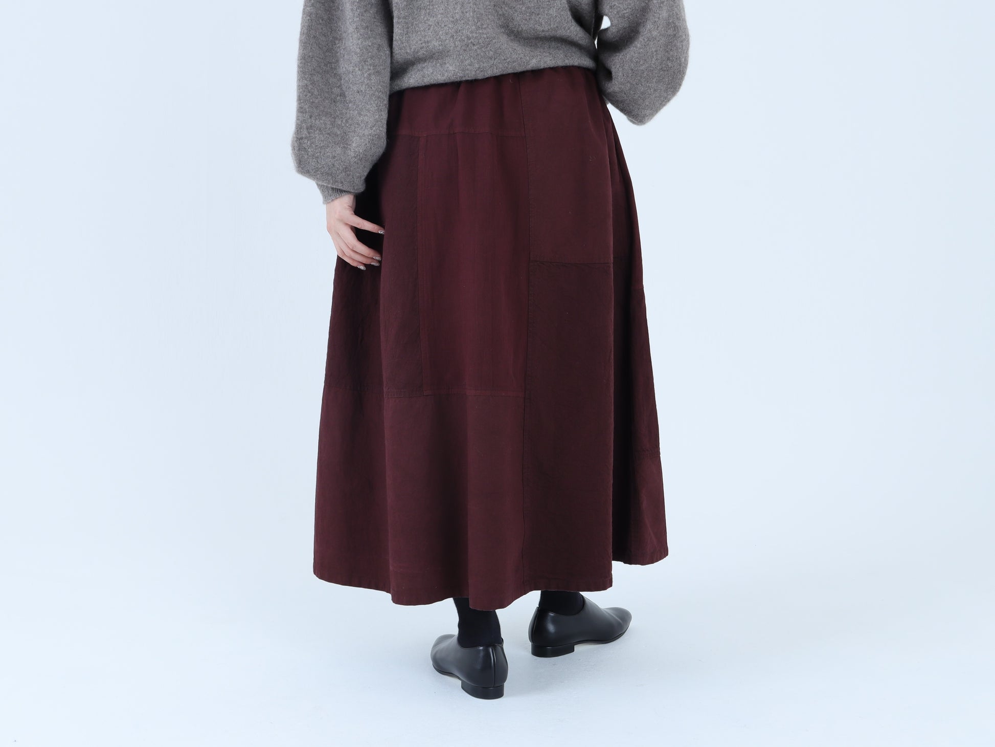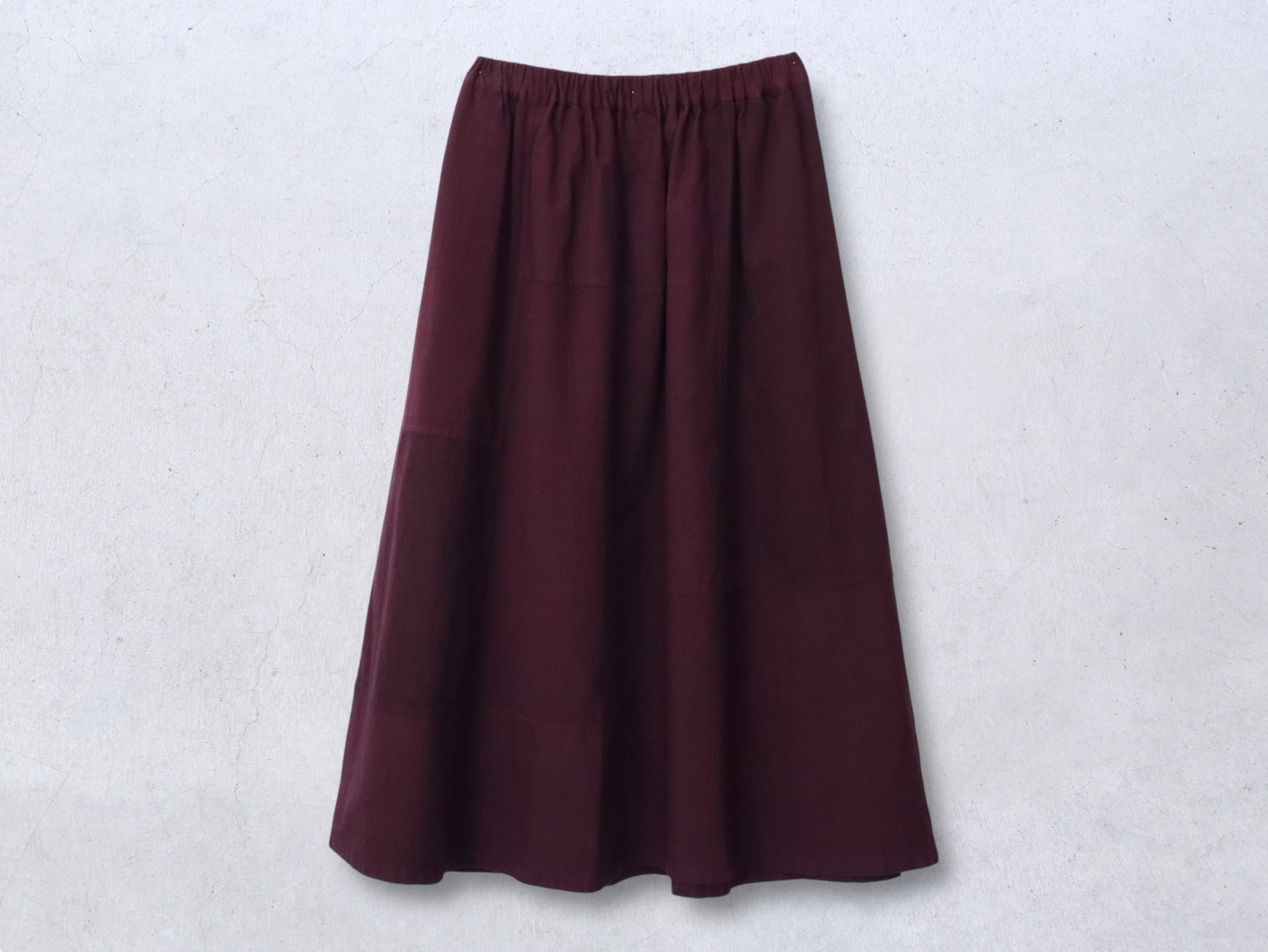 綿麻デニム、綿高密度馬布、粗野コットンの3種類の生地をパッチワークして作ったスカートです。