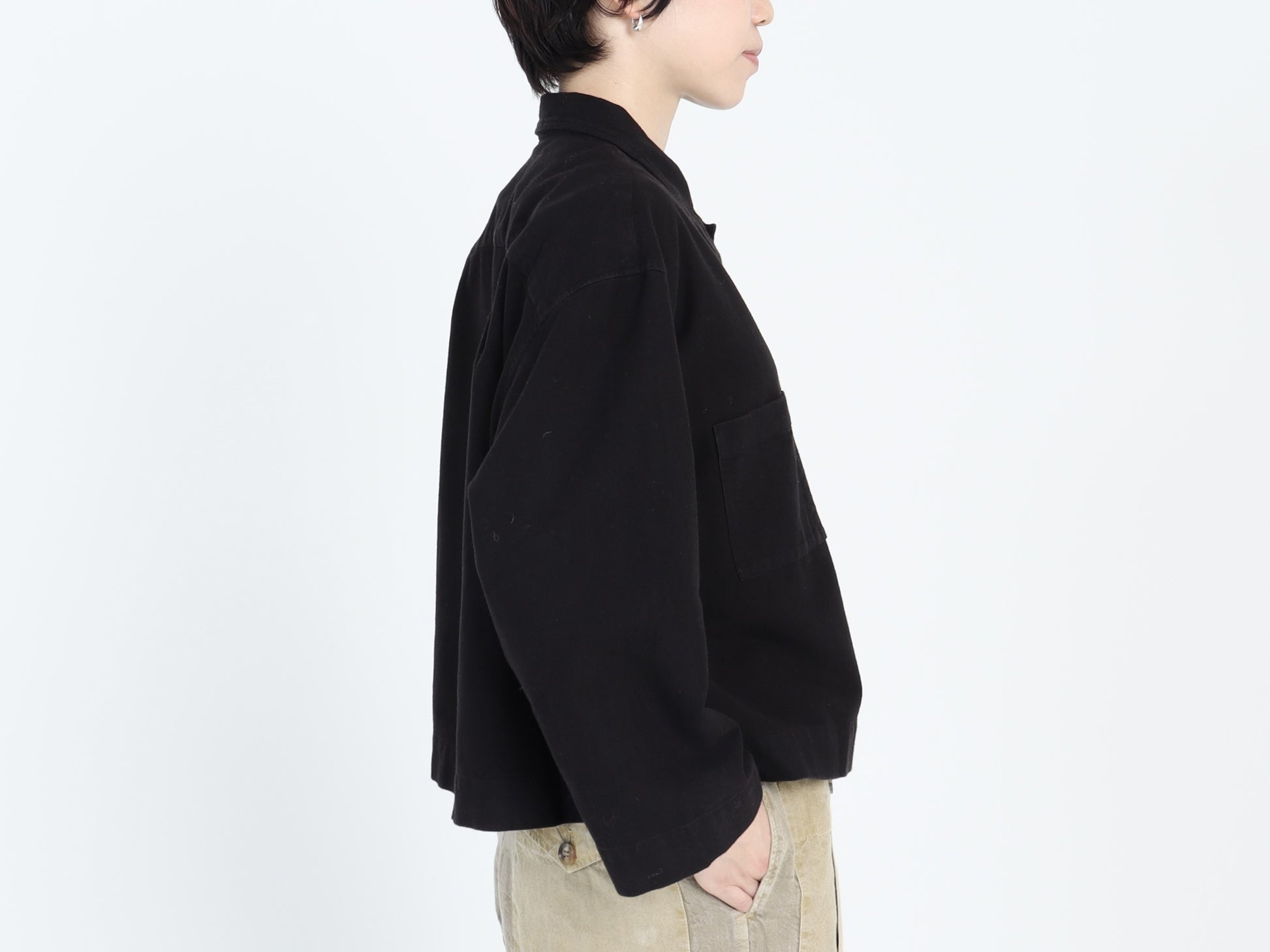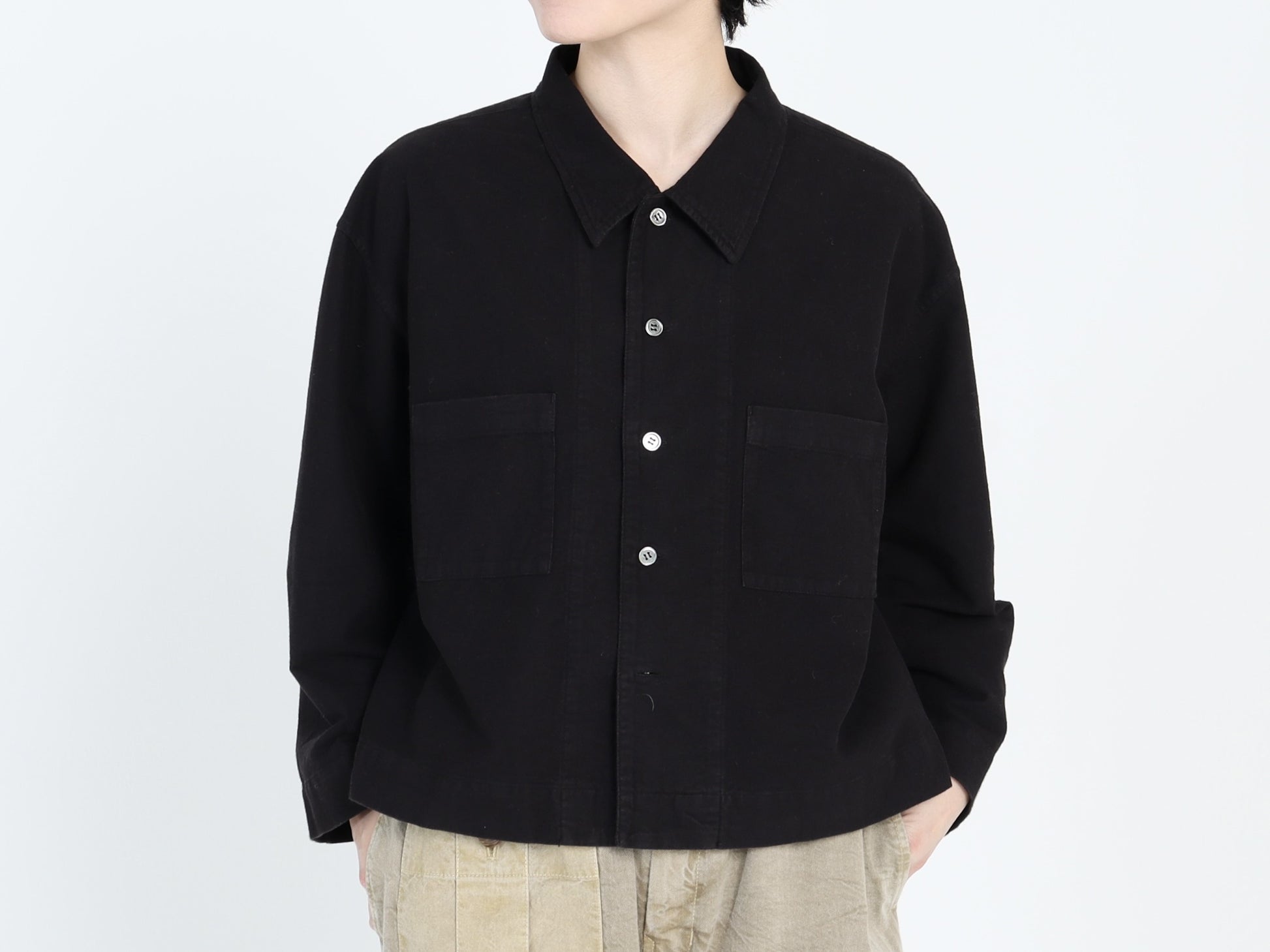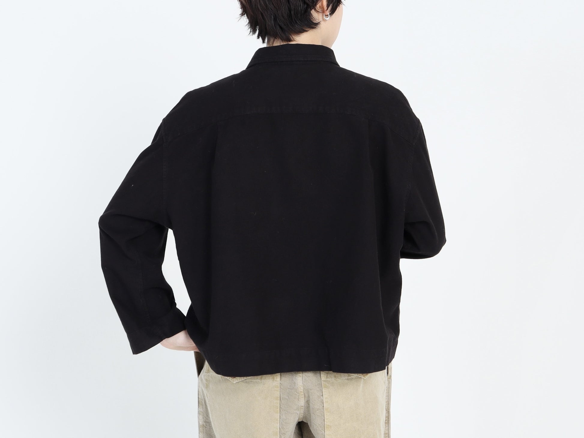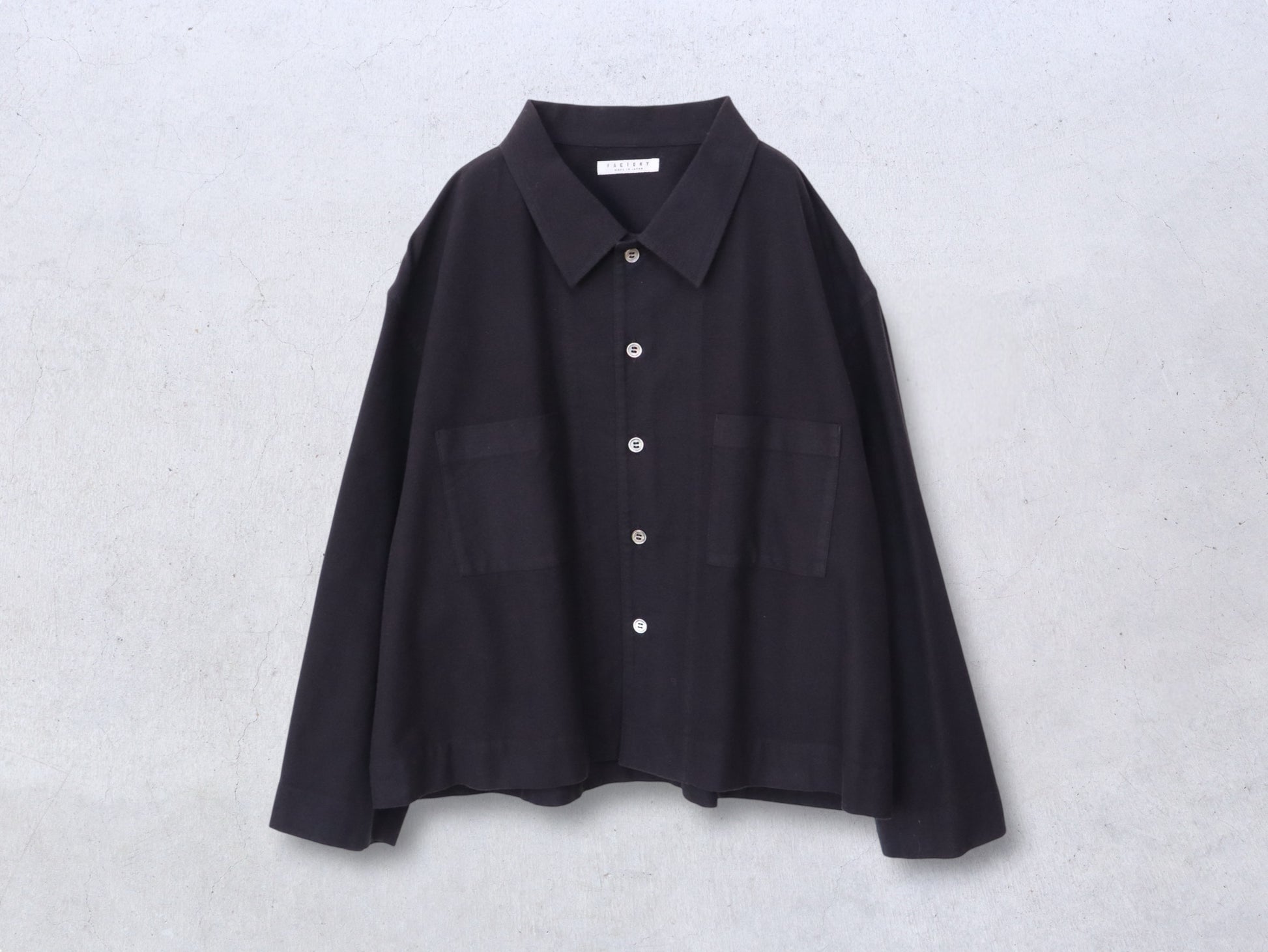 身幅が広くゆったりとした、羽織り感覚で着られるショート丈のシャツです。