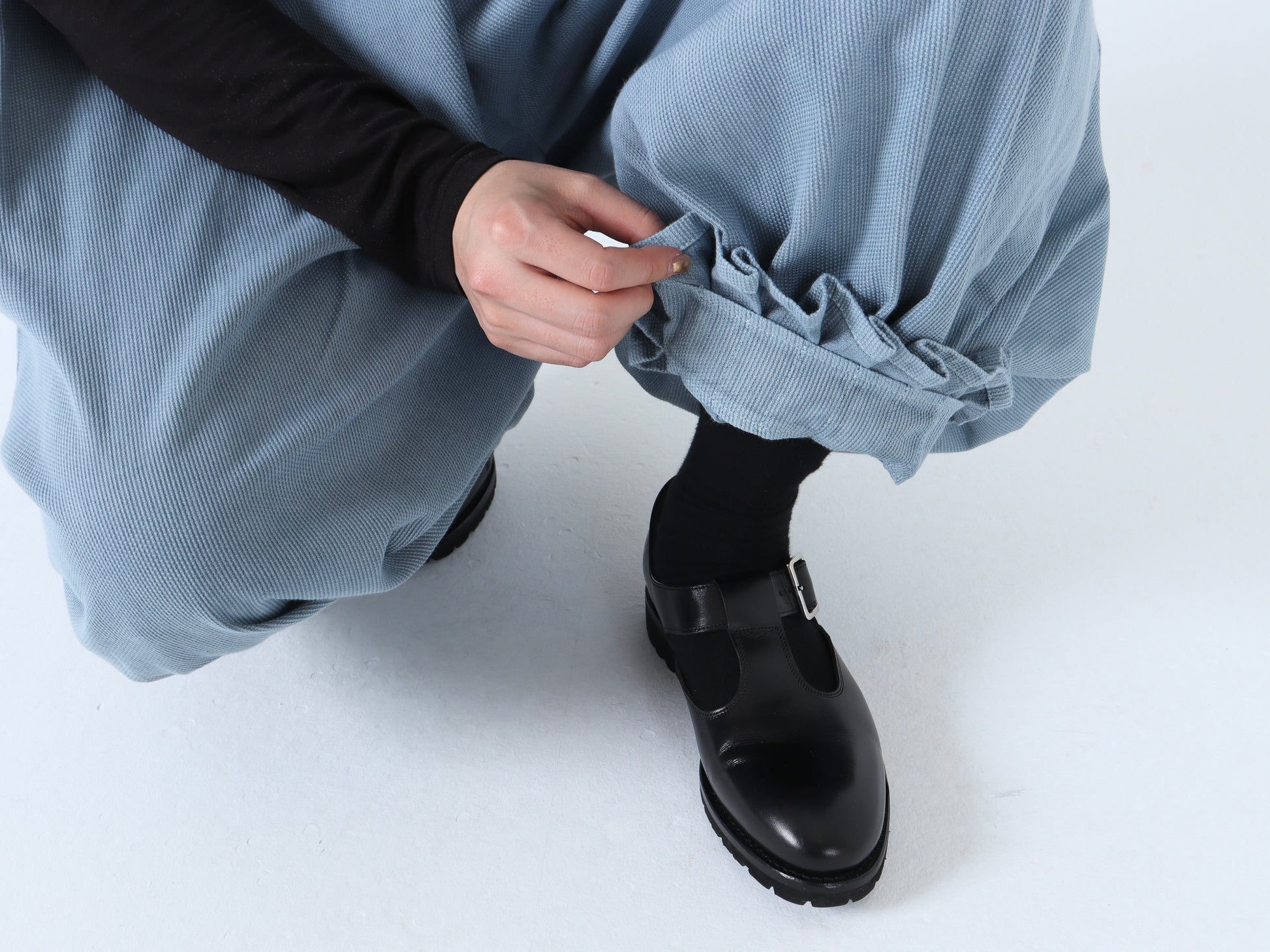 タックが入ることで腰回りと太ももにゆとりが生まれ、快適に着用できるのもポイント。ウエストには太めのゴムと平紐が入り、自分に合ったサイズに調整できるので、ストレスフリーな履き心地です。