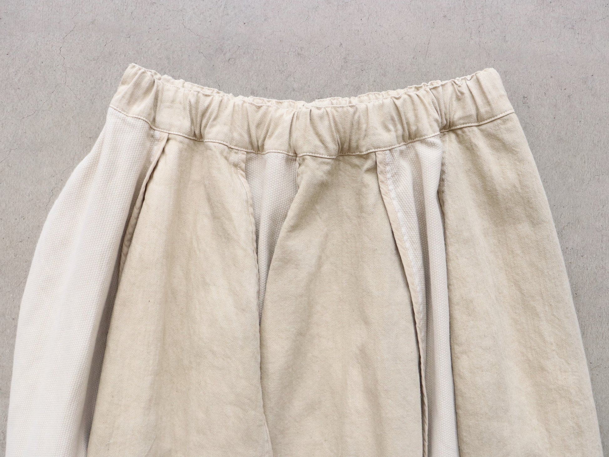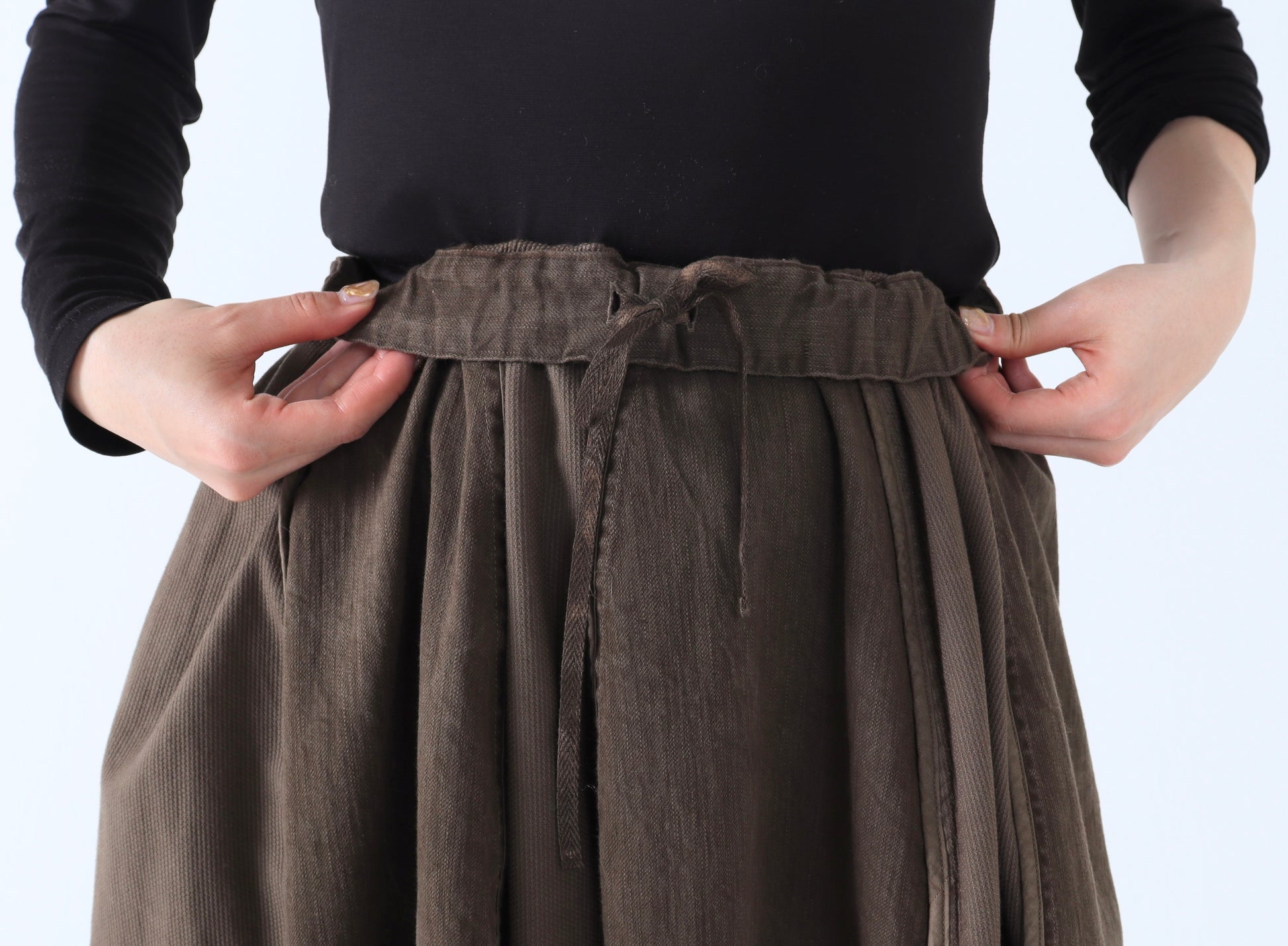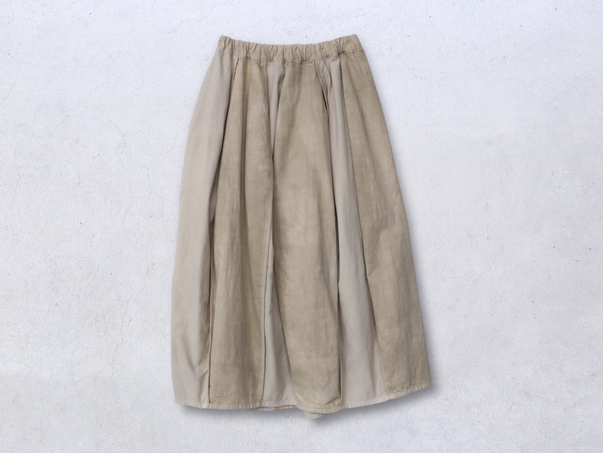 凹凸感のある刺し子と、柔らかなジンバブエコットンを交互に配置した、動きのある立体的なシルエットが魅力のパイピングスカートです。