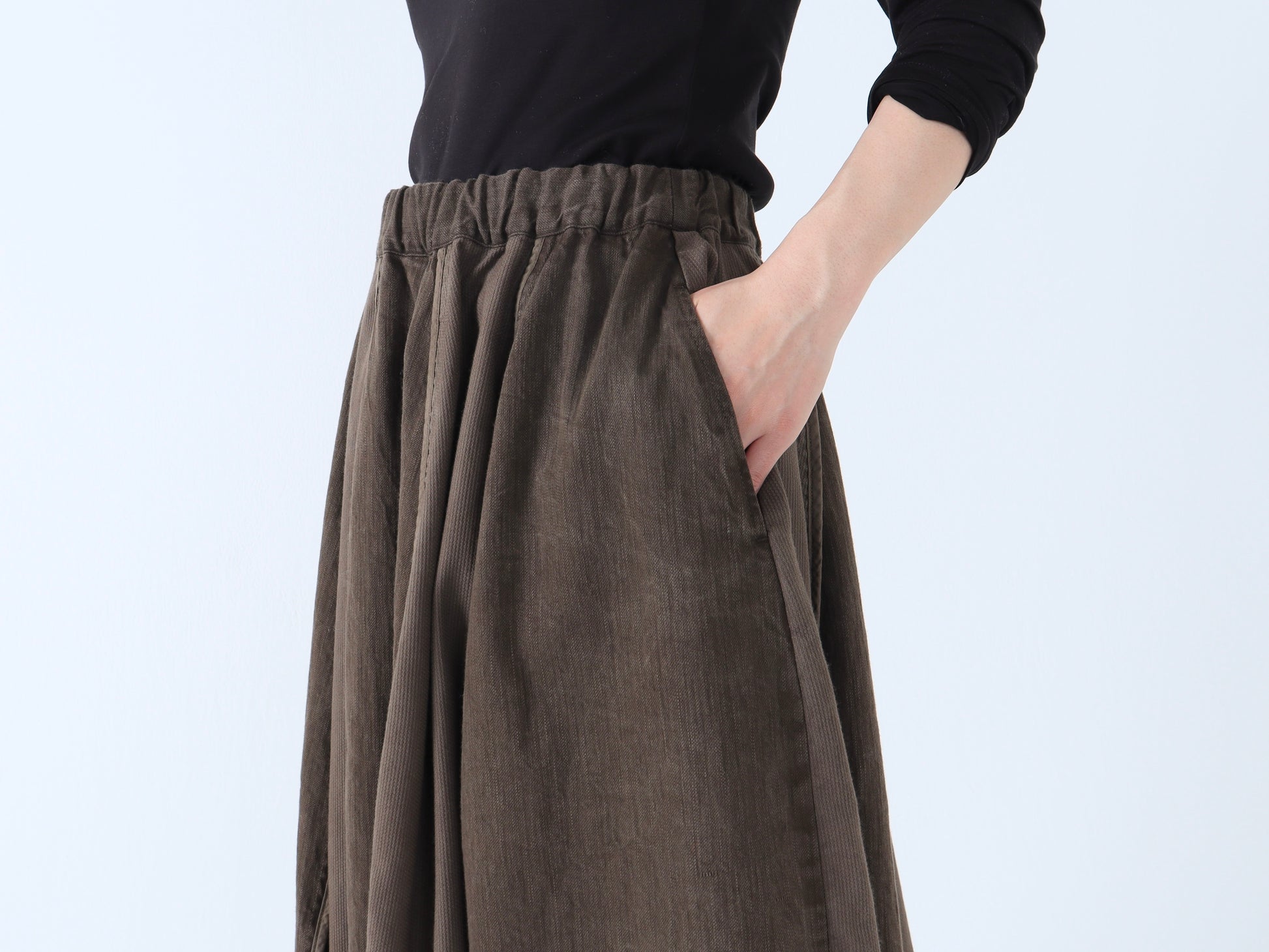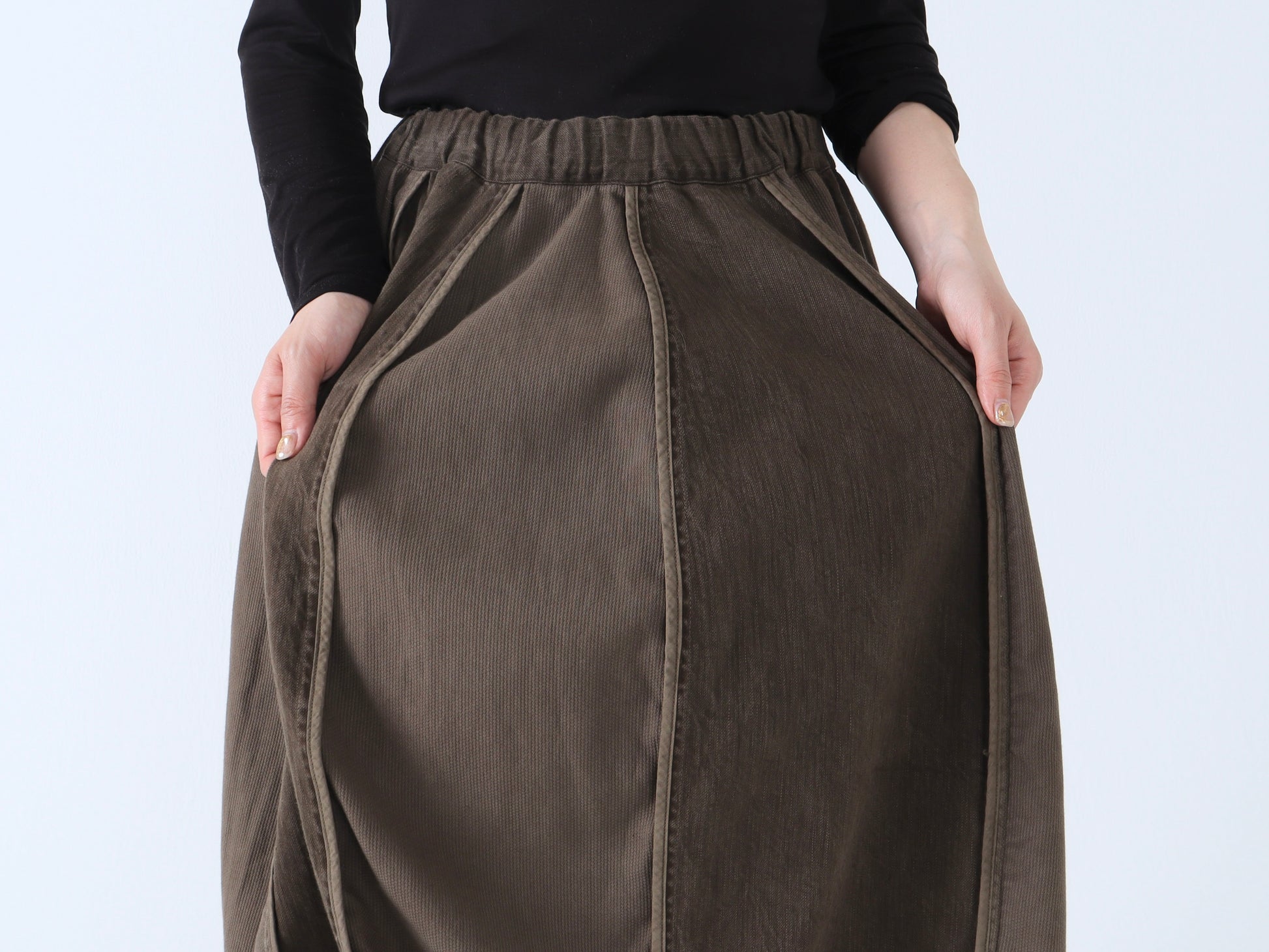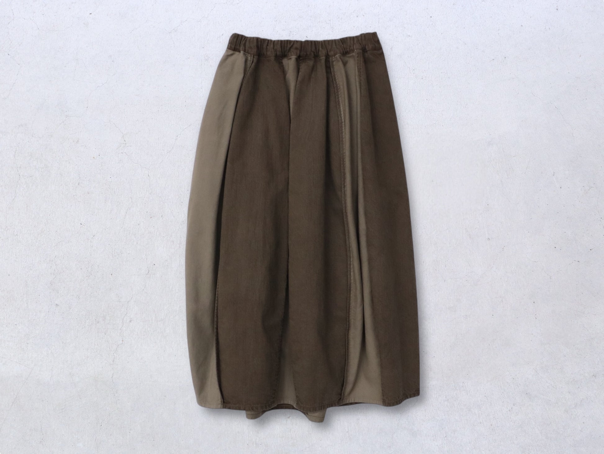 凹凸感のある刺し子と、柔らかなジンバブエコットンを交互に配置した、動きのある立体的なシルエットが魅力のパイピングスカートです。