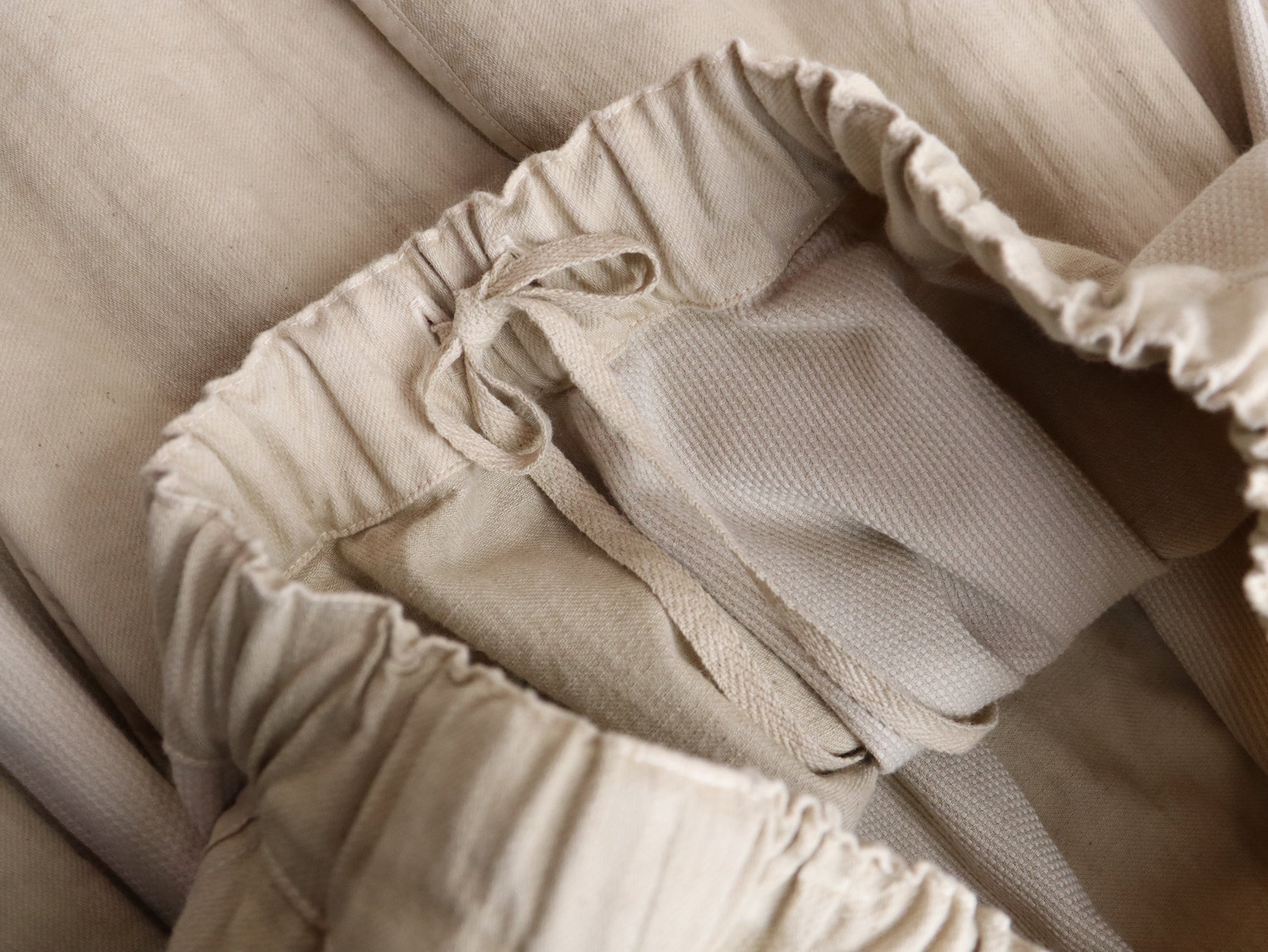 ウエストは総ゴム仕様で、内側の紐によりサイズ調節が可能。