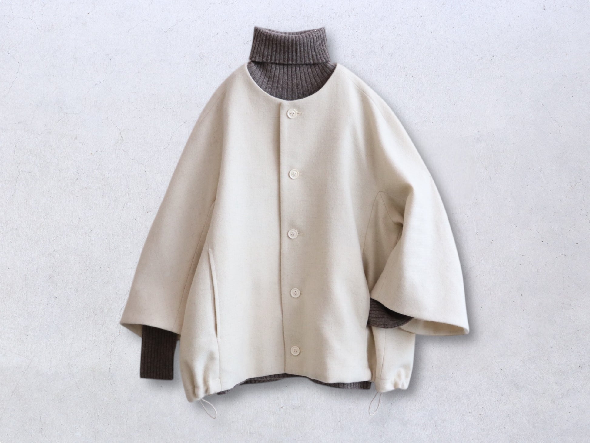 飾りのないシンプルな丸襟が首元をすっきりと見せ、タートルネックとも好相性です。