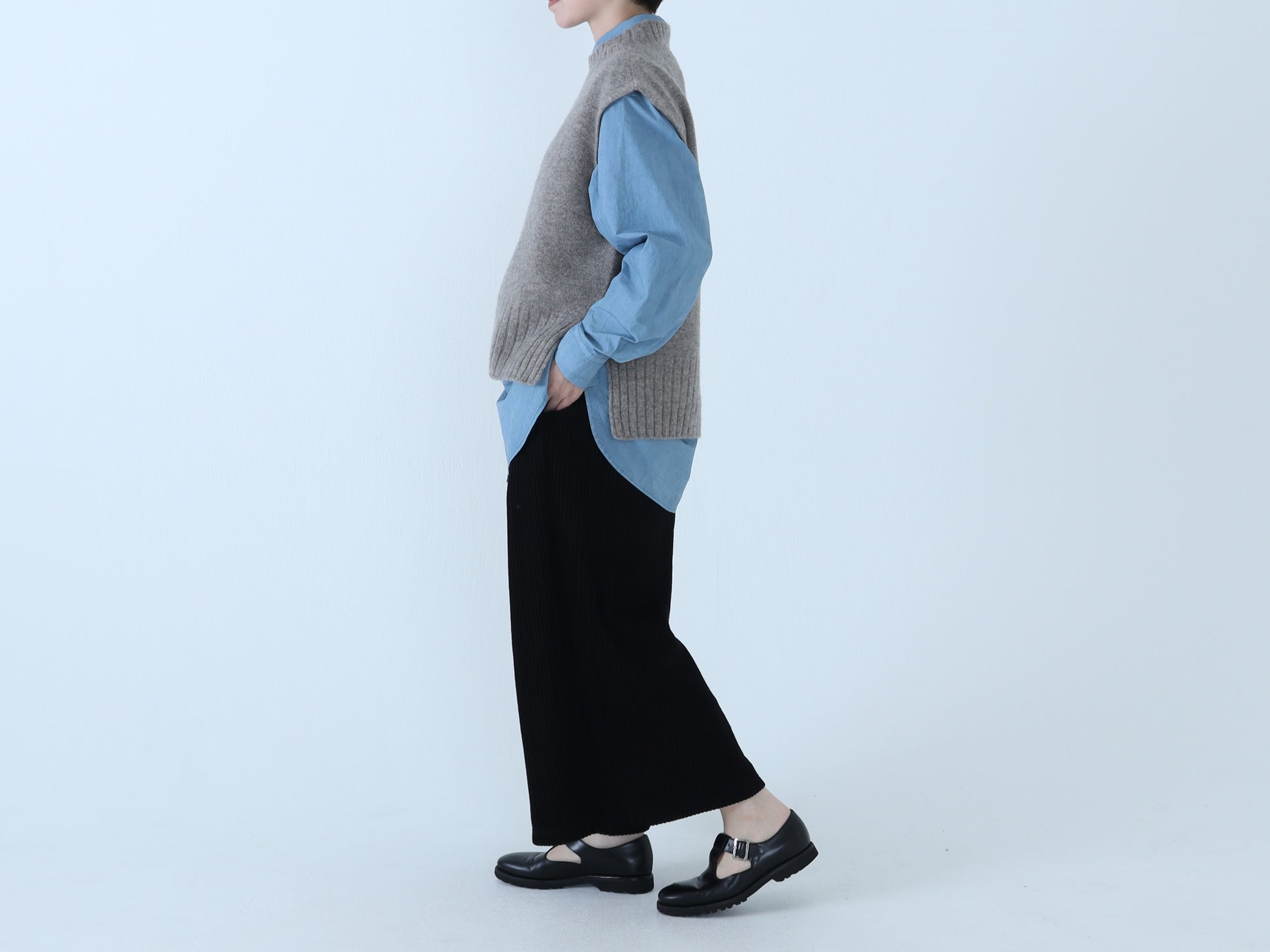 裾のスリットが動きを添え、FACTORYのシャツスリーブカットソーやブラウスとのレイヤードも美しくきまります。